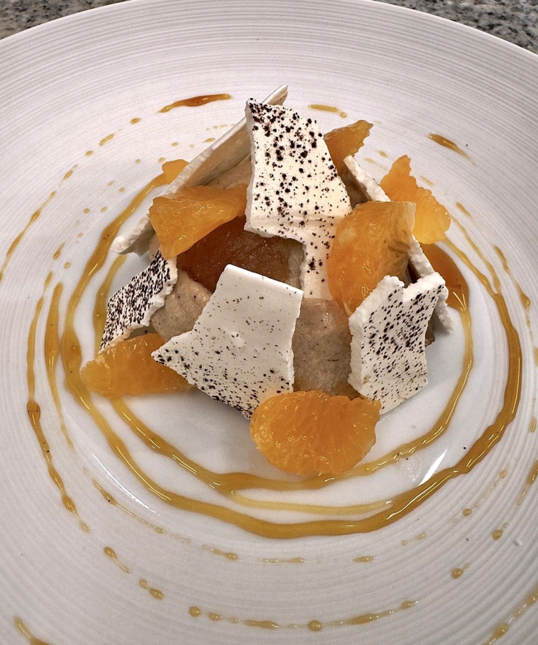 3. Ajouter les tuiles de meringue, quelques suprêmes de clémentine et un filet de sirop.
