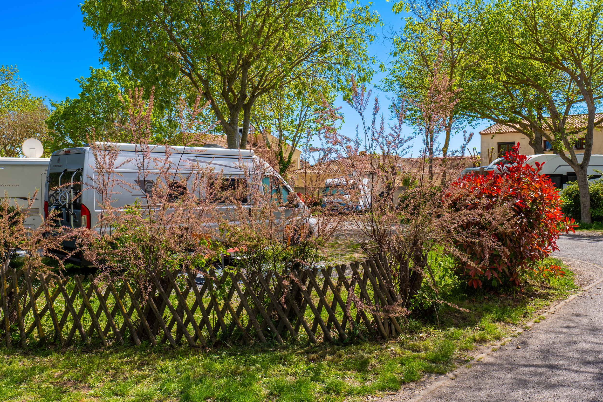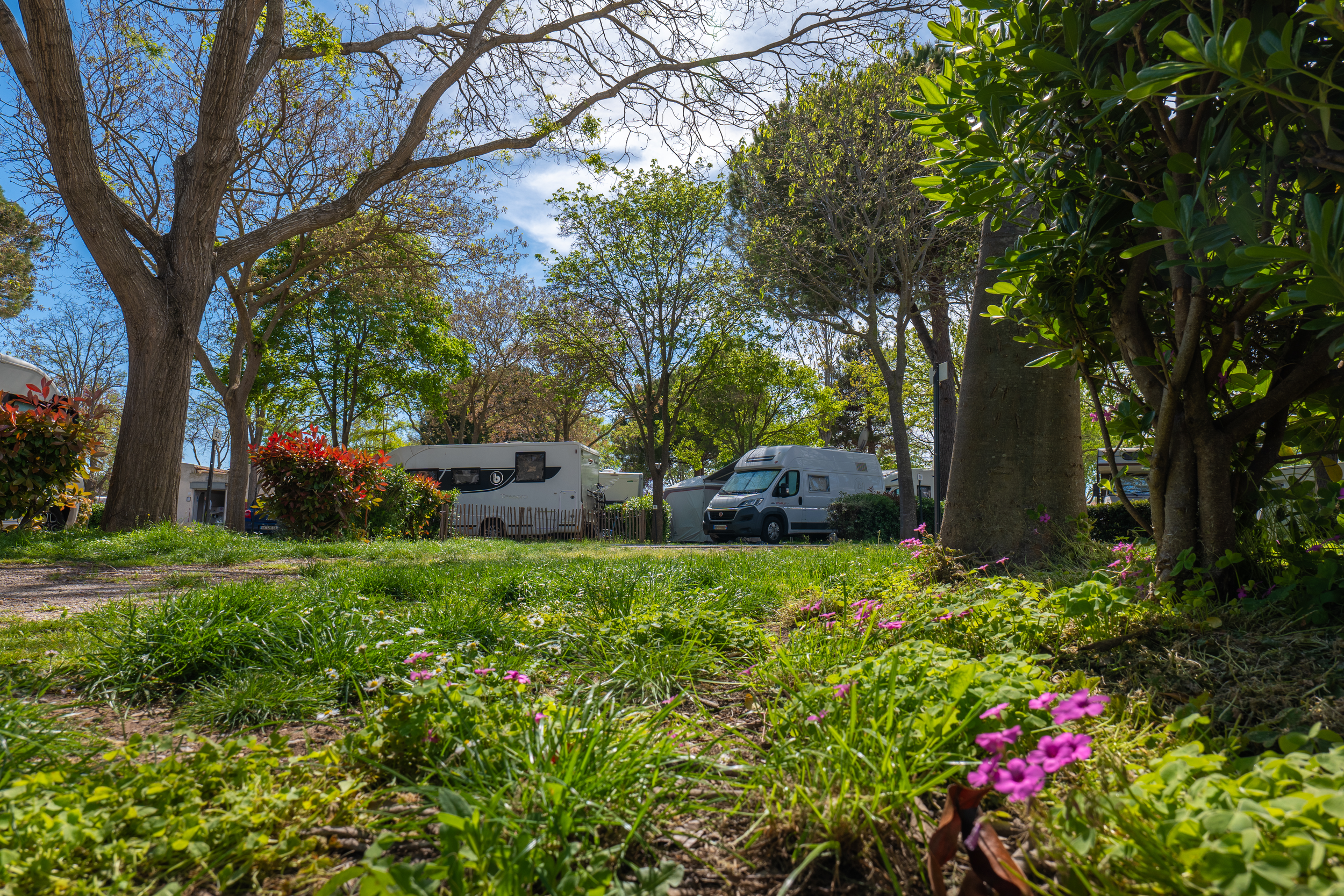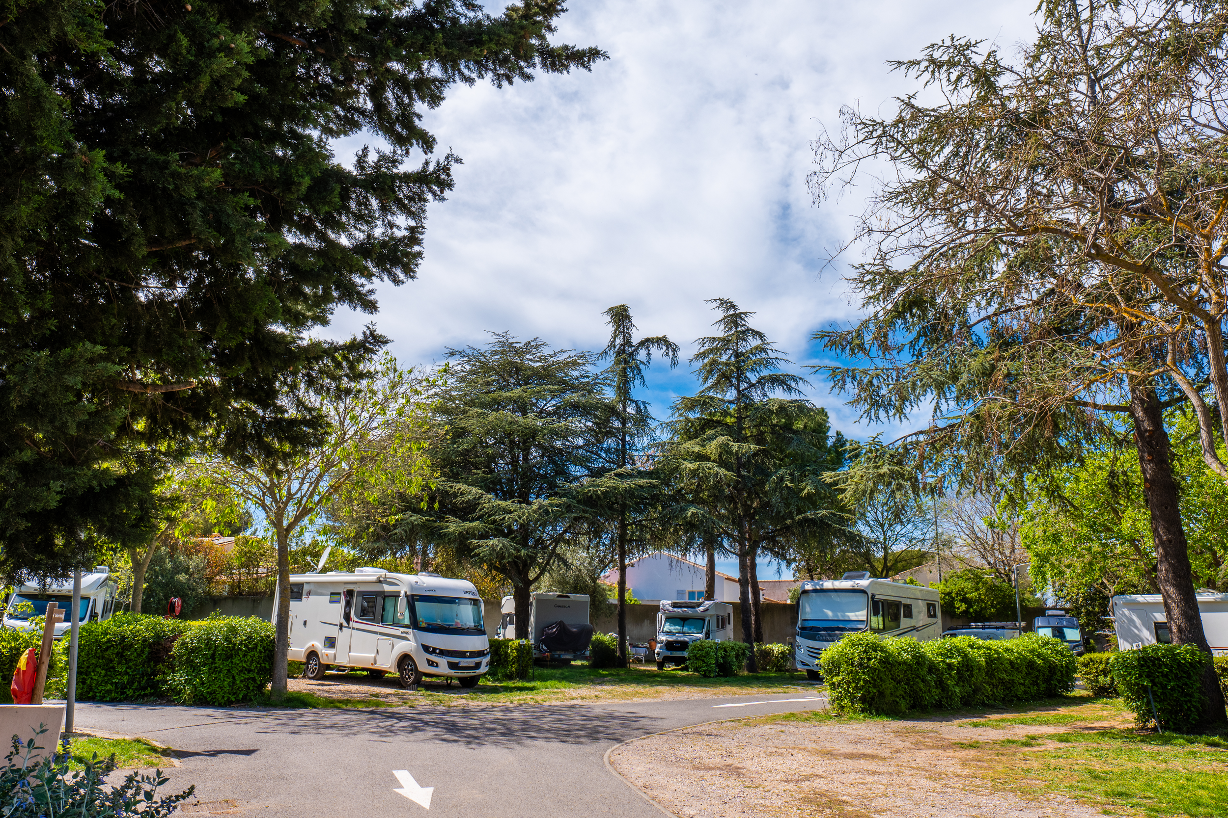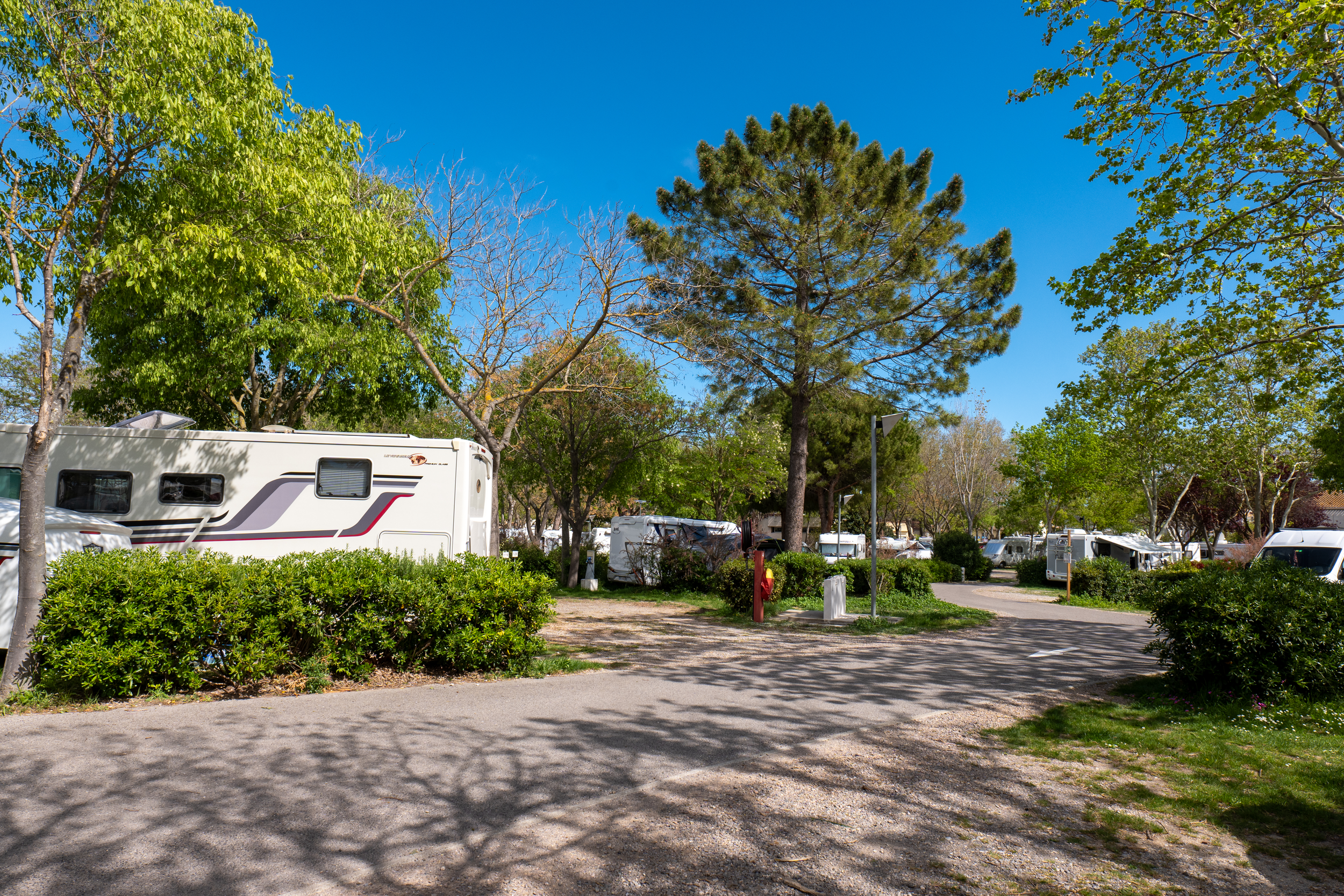 Les 126 grands emplacements individuels plats et légèrement ombragés, séparés par des haies de lauriers, sont tous équipés de prises électriques.