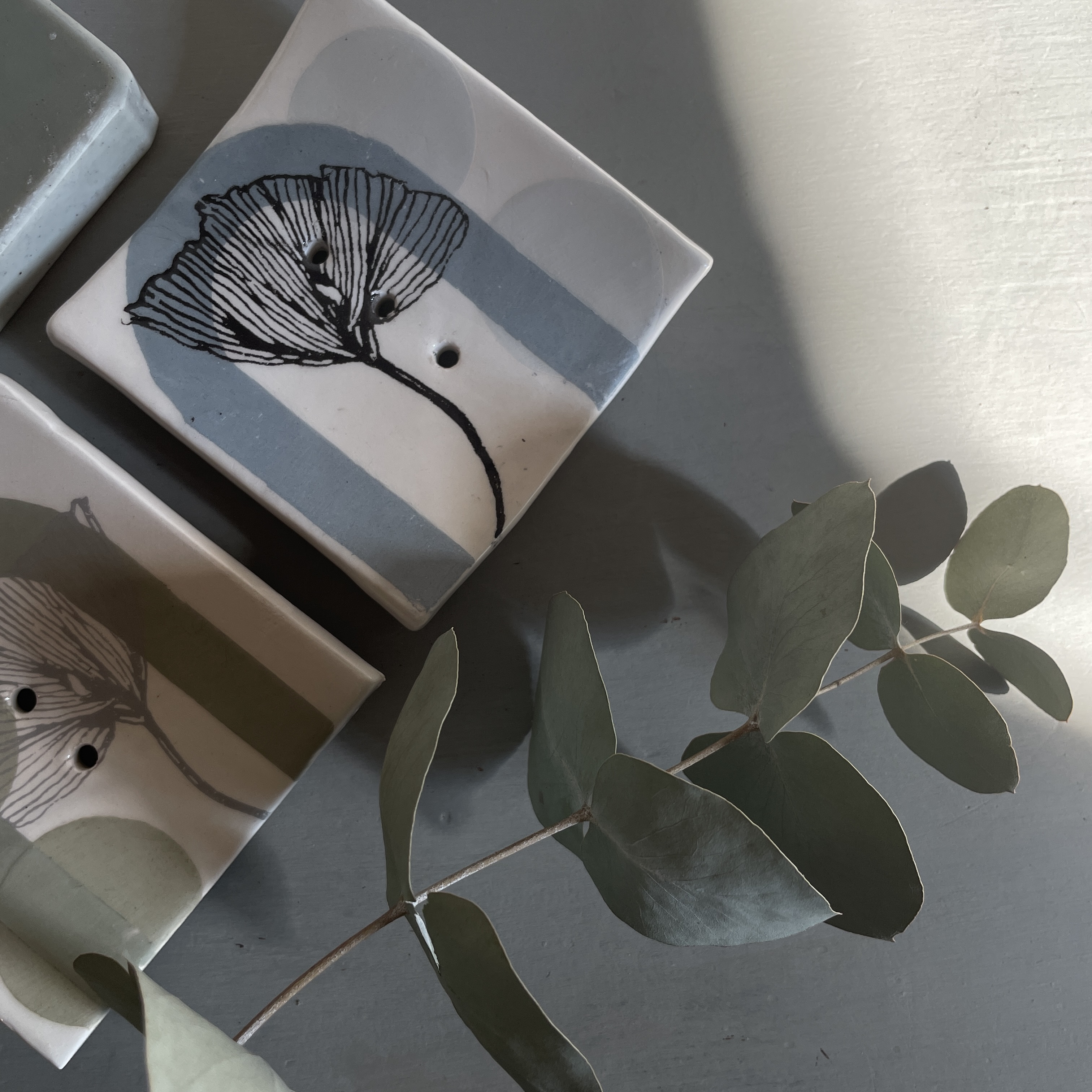 Son travail associe des éléments dessinés botaniques et des détails architecturaux en appliquant et en imprimant avec une palette subtile d’engobes, ce qui donne lieu à des pièces distinctes en série limitée.