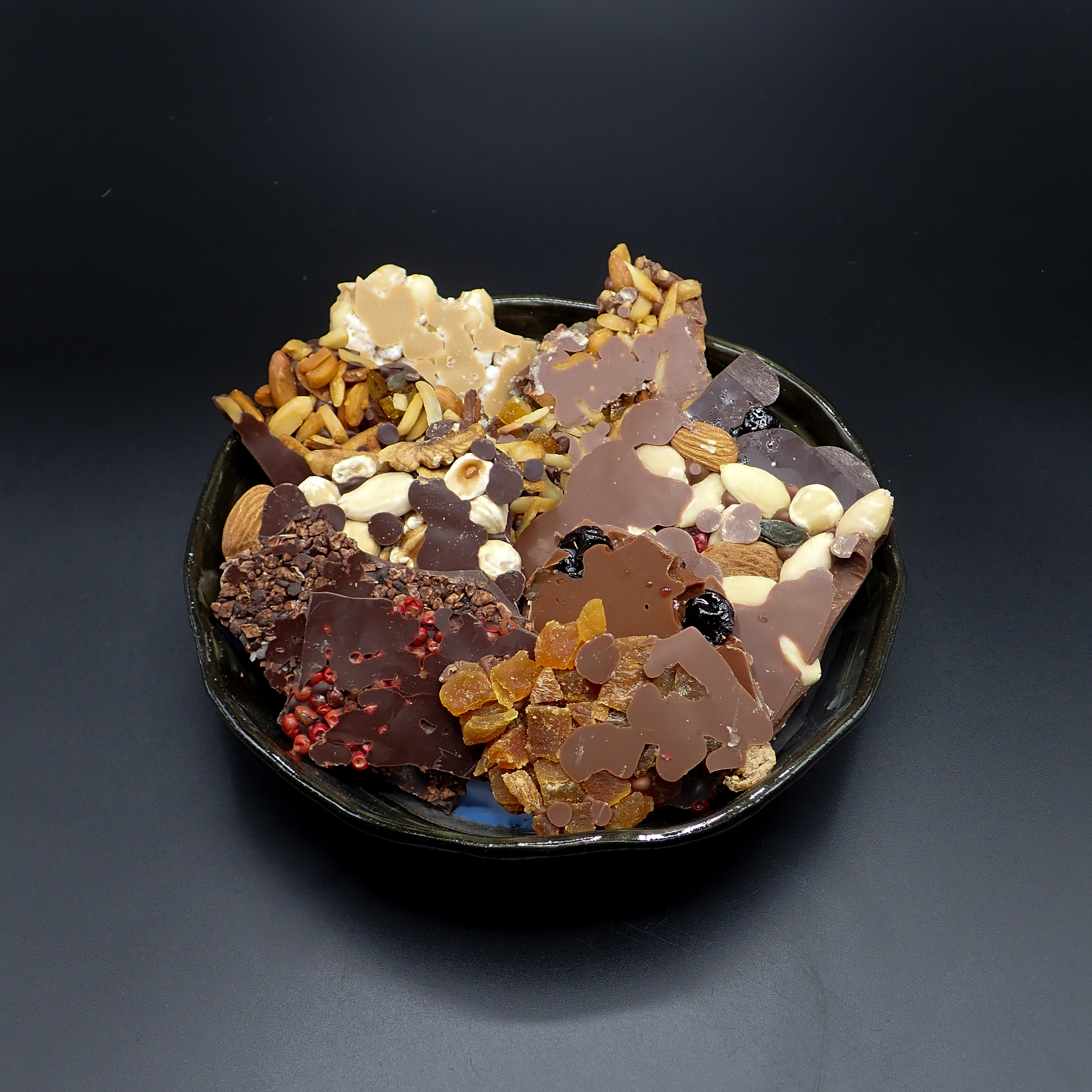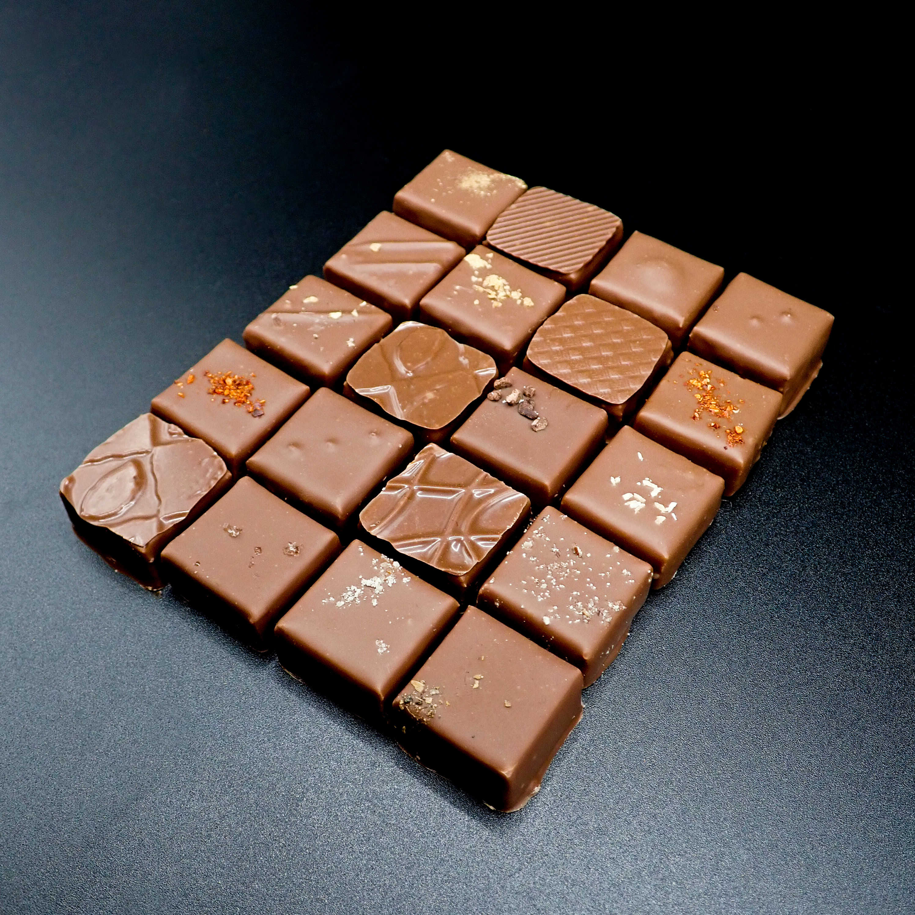 Tous nos chocolats enrobage chocolat noir, dévoilent un chocolat noir et tous nos chocolats enrobage chocolat lait dévoilent un chocolat au lait.