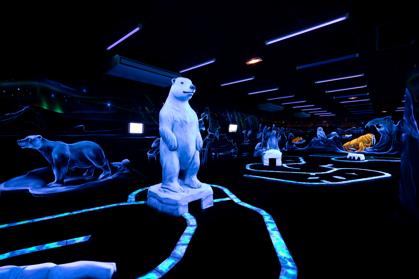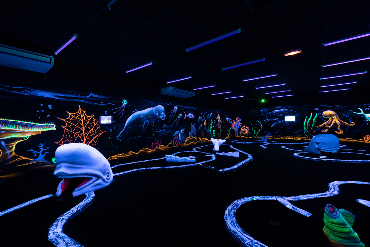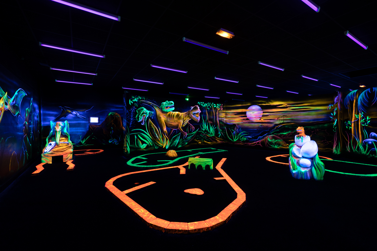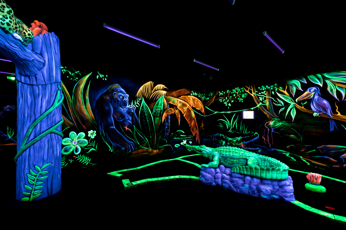 GOOLFY est un nouveau concept innovant et unique sur Montpellier : pour Enfants et Adultes, un parcours de minigolf indoor sur 450m² en lumière noire sur le thème des espèces menacées et des dinosaures en décors 3D tout en fluo.
