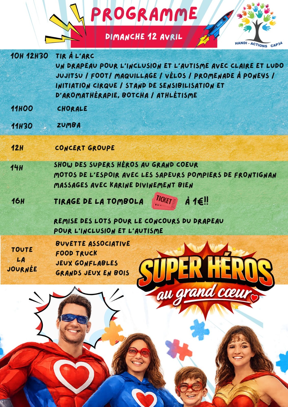 Un grand rassemblement des familles avec de nombreuses animations :Jeux gonflables et grands jeux en boisTir à l’arcCréation d’un drapeau pour l’inclusion avec Claire et LudoJujitsuFootInitiation cirqueParcours véloPromenade à poneysMaquillageBuvette et food truckGrande tombola solidaire : 1 € le ticketL’après-midi se déroulera en présence exceptionnelle des Super Héros au grand cœur, des motards de l’espoir et des Sapeurs-Pompiers pour le plus grand plaisir des petits et des grands.Ces événements sont organisés pour favoriser l’inclusion et soutenir les actions menées pour les personnes autistesNous comptons sur votre présence et votre soutien pour faire de ces moments de belles réussites solidaires.