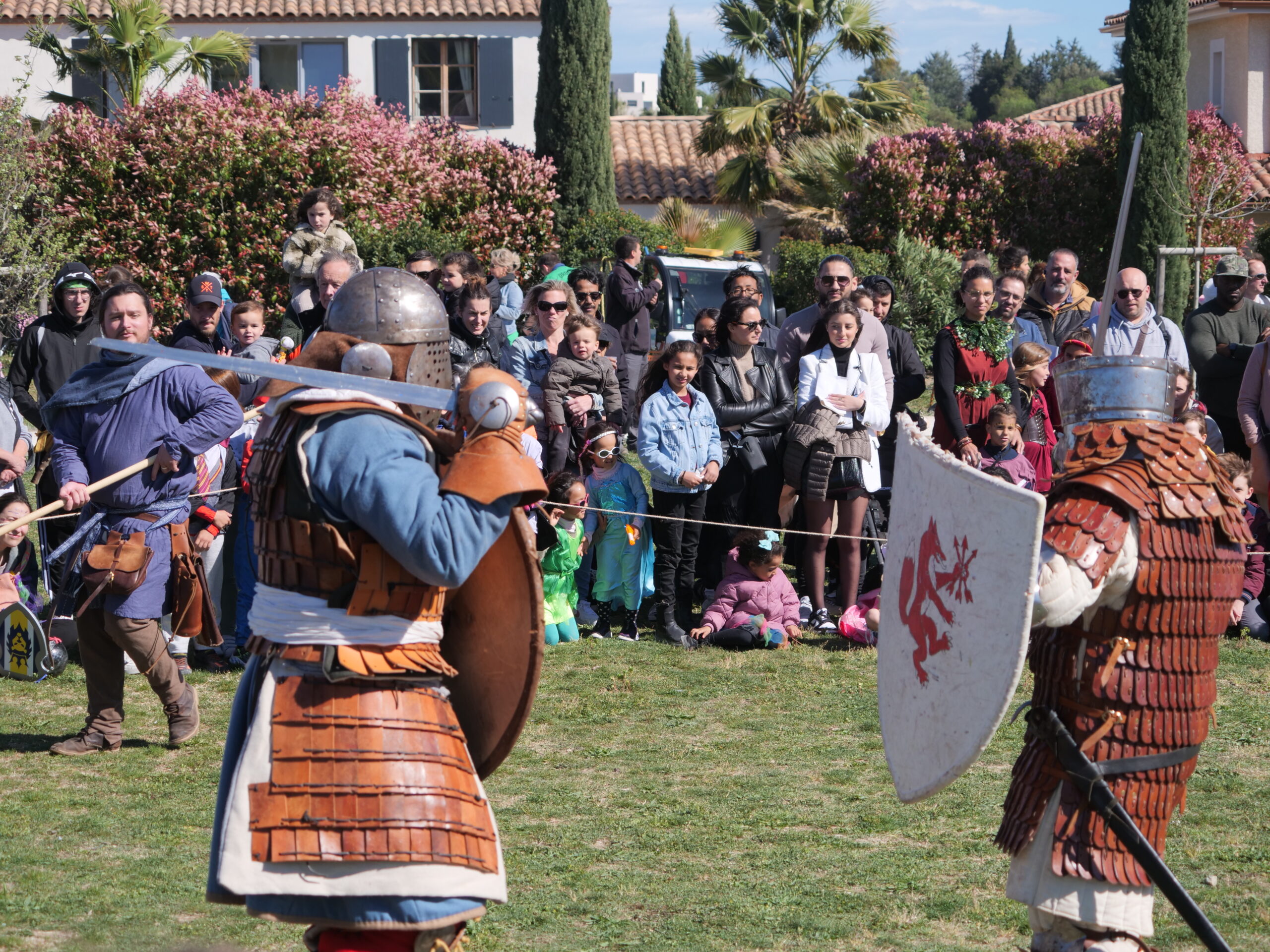 Les combats de chevaliers sont ici un support d’animation : ils permettent de capter les enfants, de raconter une histoire et d’ancrer le carnaval occitan dans le jeu et l’action.