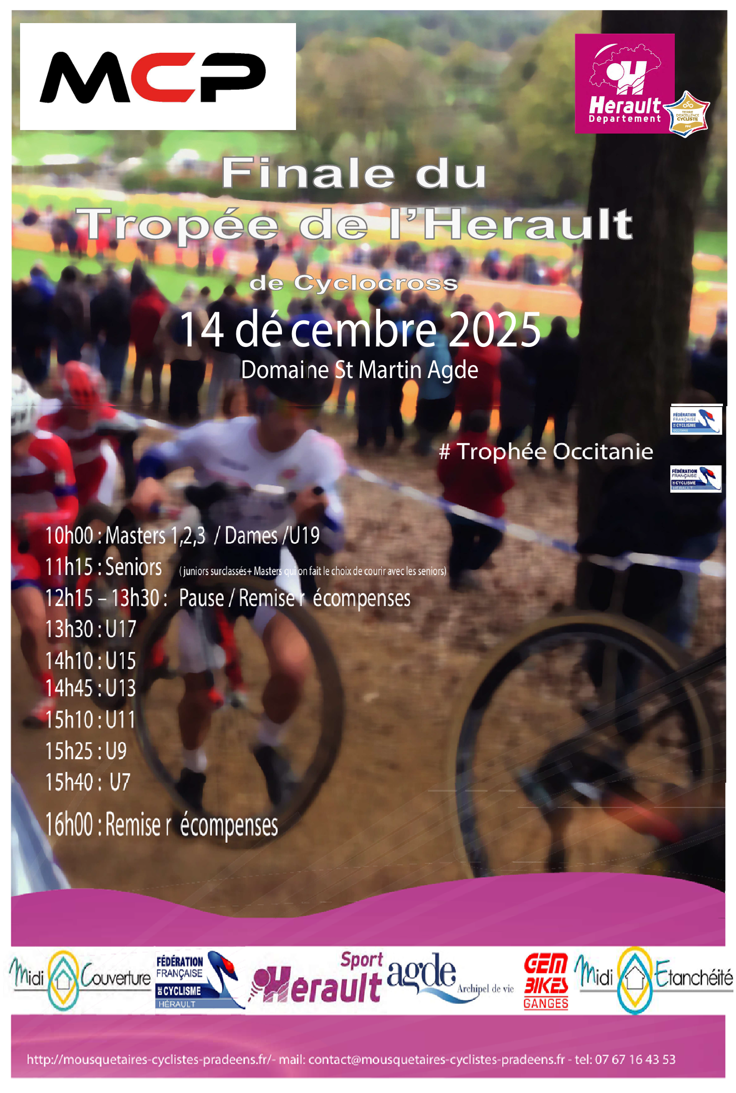 Les Mousquetaires Pradéens et le Comité Départemental de l’Hérault de Cyclisme organisent, avec le concours de la Ville d’Agde, du Département de l’Hérault et le soutien logistique d’Hérault Sport, le Challenge départemental de Cyclocross.