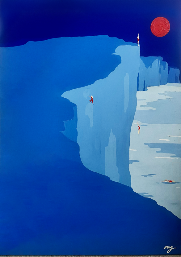 Elle les célèbre par la couleur, la composition graphique et les perspectives travaillées, transformant le quotidien en expérience à partager. Dans ses paysages, une dimension surréaliste apparaît : de minuscules figures, fragments d’elle-même, se glissent dans la scène. Elles escaladent, détournent, jouent avec l’espace comme on joue avec un souvenir.