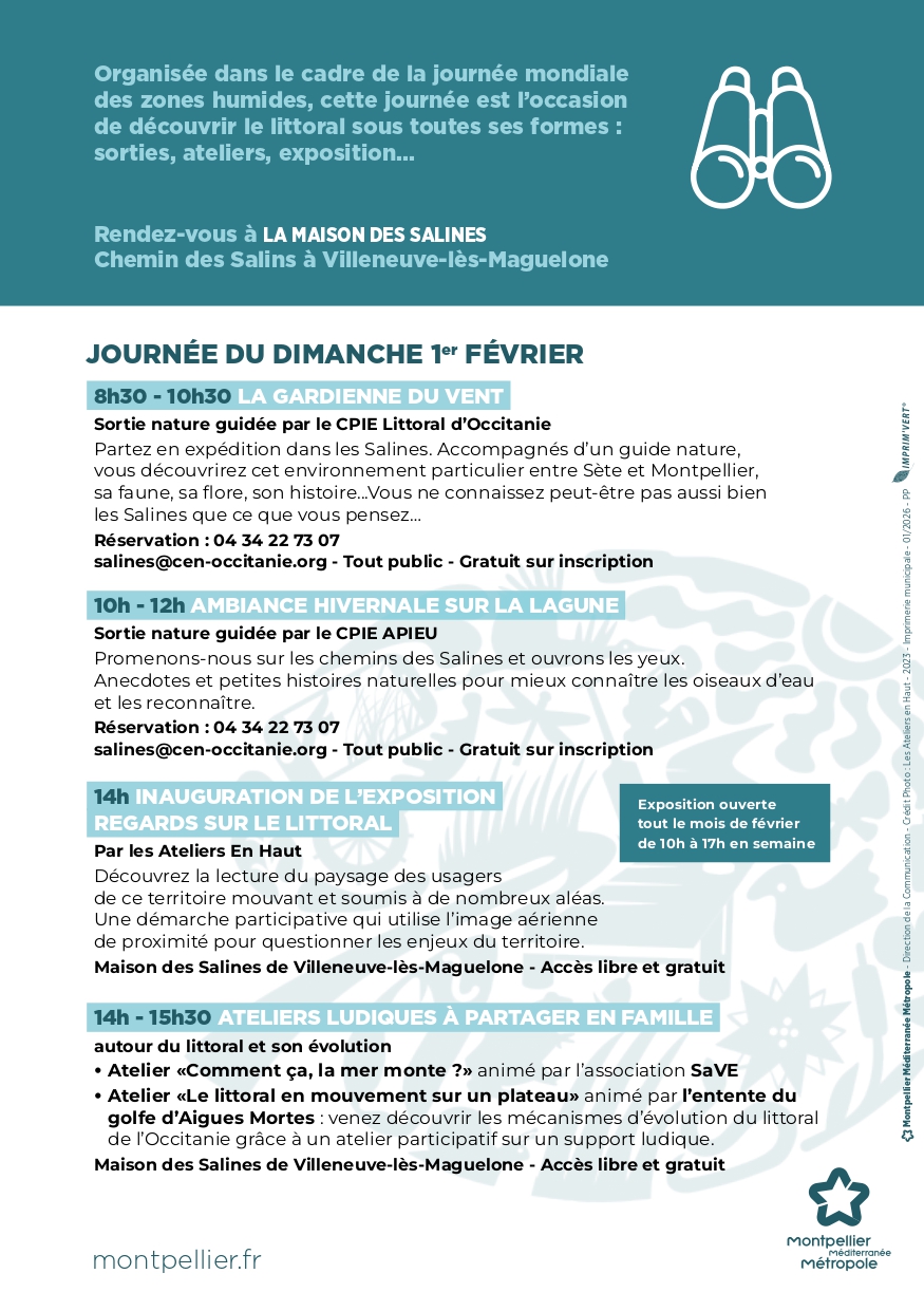 Dans le cadre de la Journée mondiale des zones humides, les Salines de Villeneuve-lès-Maguelone vous invitent le dimanche 1er février à explorer ce patrimoine naturel protégé. Exposition, journée découverte, ateliers… Entrée libre.