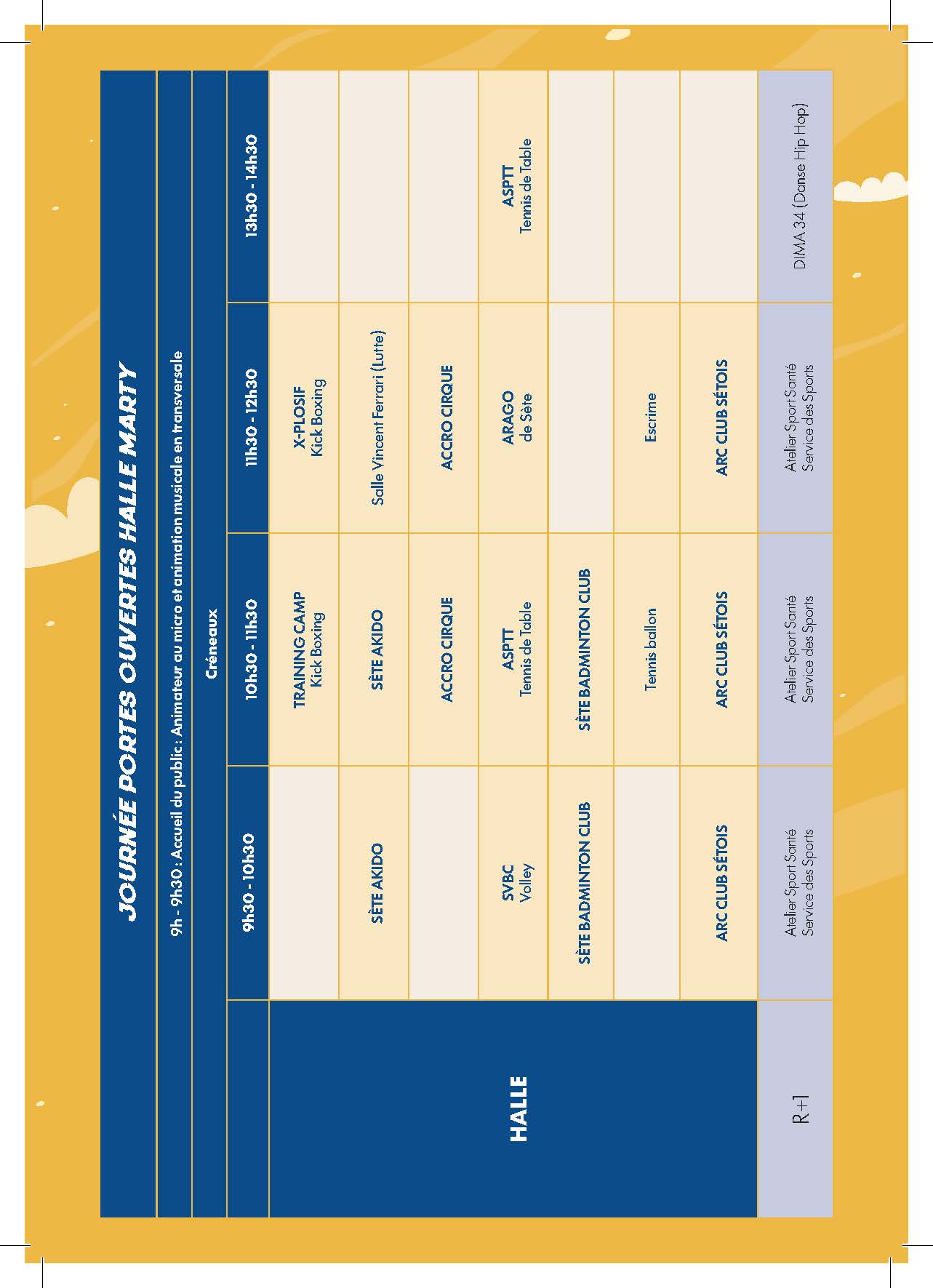 La Halle Louis Marty ouvre ses portes au public à l’occasion d’une journée dédiée à la découverte et à la pratique sportive. Tout au long de la matinée et de l’après-midi, associations et clubs sétois proposent des initiations gratuites, des démonstrations et des animations sport-santé.Au programme : sports collectifs et individuels, arts martiaux, cirque, danse, tennis de table, badminton, volley, escrime, tir à l’arc, lutte, kick-boxing, hip-hop et ateliers encadrés par le service des sports. Les animations se déroulent par créneaux horaires afin de permettre à chacun d’essayer plusieurs disciplines.Une journée ouverte à tous, pensée pour bouger, découvrir de nouvelles pratiques et rencontrer les acteurs sportifs locaux, dans un esprit convivial et accessible.