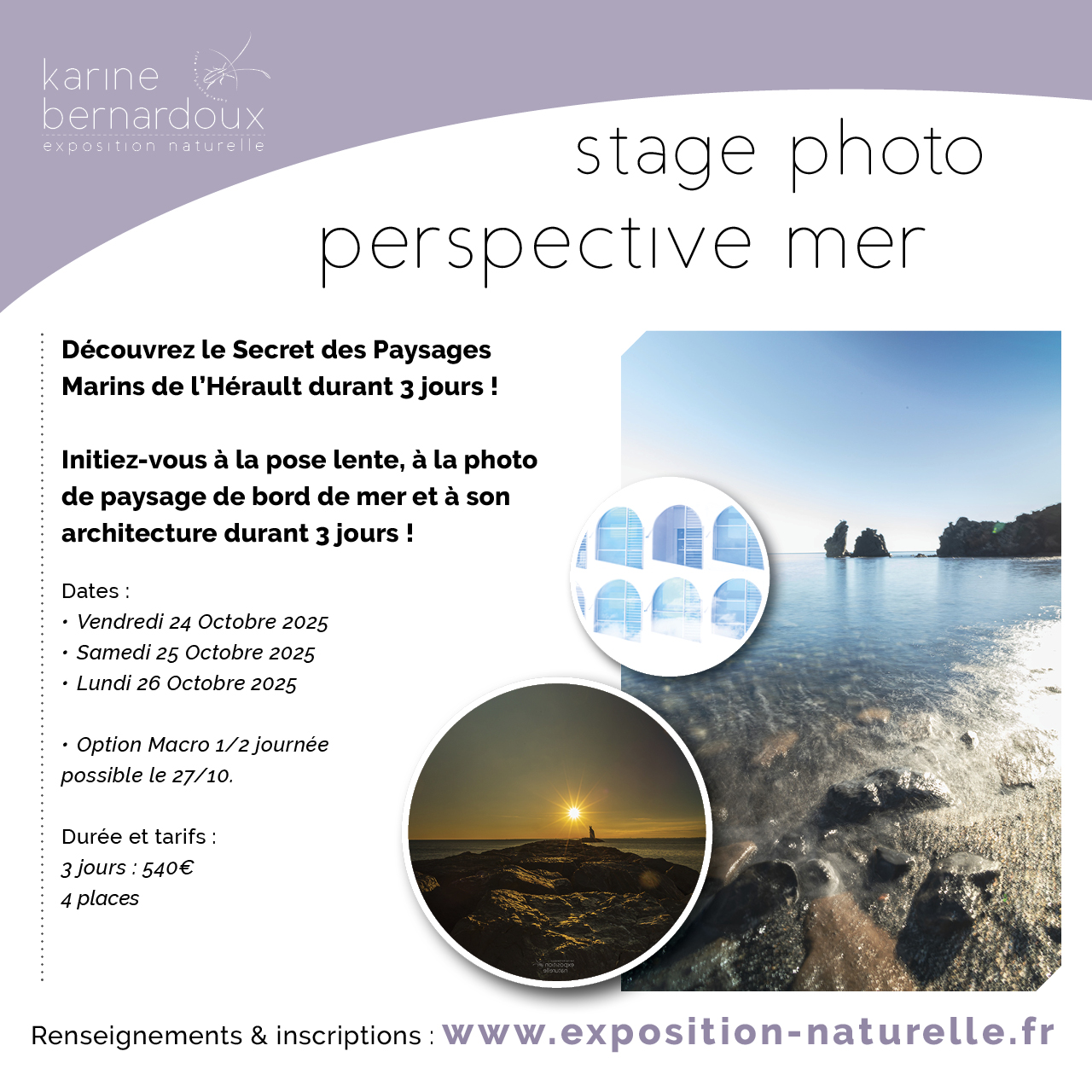 3 jours : pose lente, paysage de bord de mer autour du paysage marin ainsi que son architecture.Initiez vous à la pose lente, à la photo de paysage de bord de mer ainsi qu’à son architecture !Photos variées sur plusieurs sites.