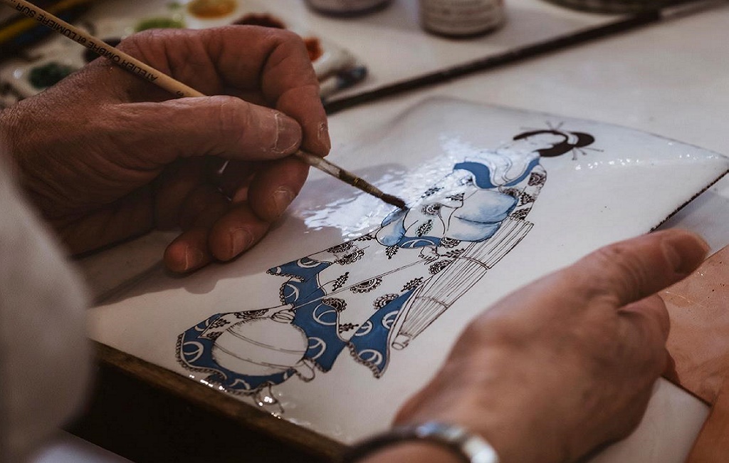 Maîtrise du trait, de la couleur, de la cuisson nécessaire à la vitrification de l’émail associés à l’art de la rigueur et de la minutie, font que chaque création est unique. Inspirés par ses thèmes de prédilection du théâtre et de la Comedia dell’Arte, ses petits formats sont des bijoux de création peints à la perfection. Le bestiaire de Jean de la Fontaine, les comtes de Lewis Carroll sont également pour elle de grandes sources d’inspiration.