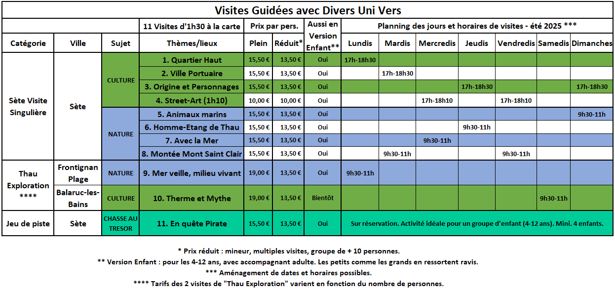 [NOUVEAUTÉ 2025]Divers Uni Vers vous invite à explorer les espaces salés à travers sa visite commentée « Mer veille, milieu vivant – Frontignan-Plage ».C’est une sortie nature, à la plage des Aresquiers, entre mer et espace salés. Venez-vous en mettre plein les yeux : plage et coquillages, prés salés et oiseaux migrateurs, comme les flamants roses !Tout se fait à pied, en petit groupe, sur une zone restreinte afin d’en extraire sa richesse. Marine, la guide, est passionnée et passionnante.Il existe une version adulte et une version enfant.Présentation de la visite commentée « Mer veille, milieu vivant à Frontignan-Plage »Vous vous baladerez entre mer, espaces salés et canal.Sur la plage, des débris sont laissés par la mer. Ce sont des éléments provenant d’animaux et de végétaux. Vous tenterez d’en identifier certains. C’est comme partir à la découverte de la vie marine.Les usages de la mer et des plages sont divers. L’écosystème de la plage est déséquilibré. Marine vous transmetdes clefs de compréhension sur l’érosion du littoral, les aménagements humains réalisés et les projections futures.Derrière les plages, vous trouverez les prés salés. Diverses espèces animales et végétales sont adaptées à ces milieux. Vous y observerez essentiellement des oiseaux migrateurs. Il y a de fortes chances que vous puissiez même y observer les flamants roses ! Vous contemplerez leurs beautés et vous découvrirez leurs modes de vie.Le canal du Rhône à Sète est un axe aquatique important, qui relie votre territoire au reste de la France. Pour finir la sortie, vous l’enjamberez tout en vous dirigeant vers le quartier de pêcheur.Une sortie nature qui vous en met plein les yeux !Pour les familles avec enfant, il existe la version enfant (4-12 ans, accompagné) :Plage et Oiseaux – Frontignan Plage -À partir de la collecte de ce que laisse la Mer sur la plage, vous redécouvrirez la vie marine. Derrière la plage, munis de jumelles, vous observerez des oiseaux comme les flamants roses. Certains ont leur bébé.Informations pratiques :Réservation obligatoire : 07 52 82 52 35 ou via marine@diversunivers.netDurée : 1h30.Période : Toute l’année.Jour et horaire :Les jeudis de 15h à 16h30En été, les sorties sur Sète et le bassin de Thau ont des jours et heures prédéfinis. Vous pourrez télécharger le planning de l’été pendant la saison estivale.Lieu de rencontre : Entrée principale de la plage des Aresquiers, en arrivant depuis le parking Saint Eugène.Pour y accéder :Tout proche de la voie cyclable de Frontignan Plage.A côté de l’arrêt de bus ligne 16 arrêt final : Saint Eugène.A côté du parking Saint-Eugène.Fin de la visite : devant le hameau et la forêt des Aresquiers.Recommandations : Prenez des chaussures confortables, une tenue adaptée à la météo et de l’eau.Informations sur Divers Uni Vers :Les visites se réalisent toute l’année, sur réservation (07 52 82 52 35 ou marine@diversunivers.net).Les visites ont une approche transversale, qui inclut divers éclairages : environnemental, géographique, géologique, socio-culturel, etc. Marine aime transmettre sur le territoire, à travers, entre autre, l’éducation à l’environnement.Divers Uni Vers propose des visites commentées à Frontignan Plage et également ailleurs sur le bassin de Thau : Sète et Balaruc-les-Bains. N’hésitez pas à demander pour plus d’informations !Marine de Divers Uni Vers serait ravie de vous accompagner et vous guiderpour des sorties pédagogiques, ludiques et responsables.