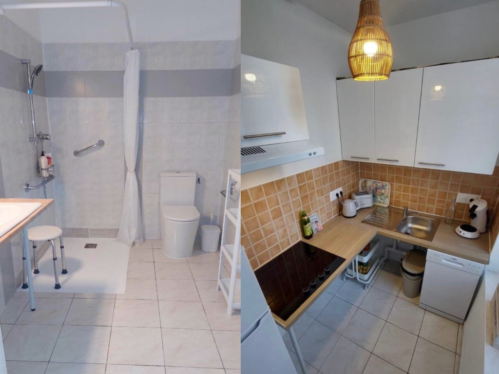 Accueil de personne en situation de handicap moteur : Appartement PMR. Aucune marche, portes largeur 0.93 de largeur, douche à l’italienne, wc surélevé, barres d’appuis, grande largeur qui favorise les déplacements dans l’appartement, évier et lavabo libre de dessous pour accès à une personne en fauteuil,accès par la terrasse via la voie publique, interrupteurs visuels