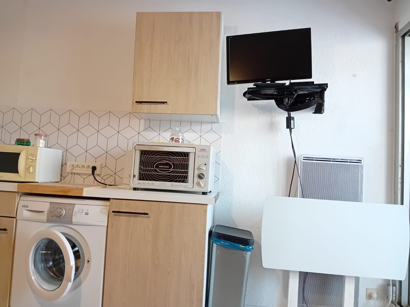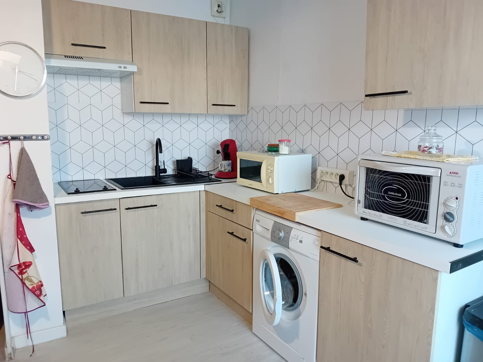 La cuisine entièrement équipée comprend tout le nécessaire pour préparer vos repas : four, machine à laver, machine à café Senseo, plaques de cuisson et ustensiles.