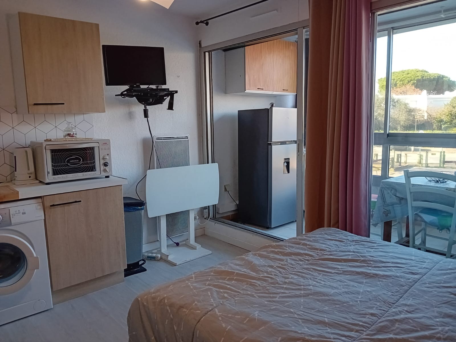 Le séjour lumineux comprend un lit escamotable en 140 cm, ainsi qu’une télévision et une connexion Wi-Fi, pour rester connecté pendant vos vacances à La Grande-Motte.