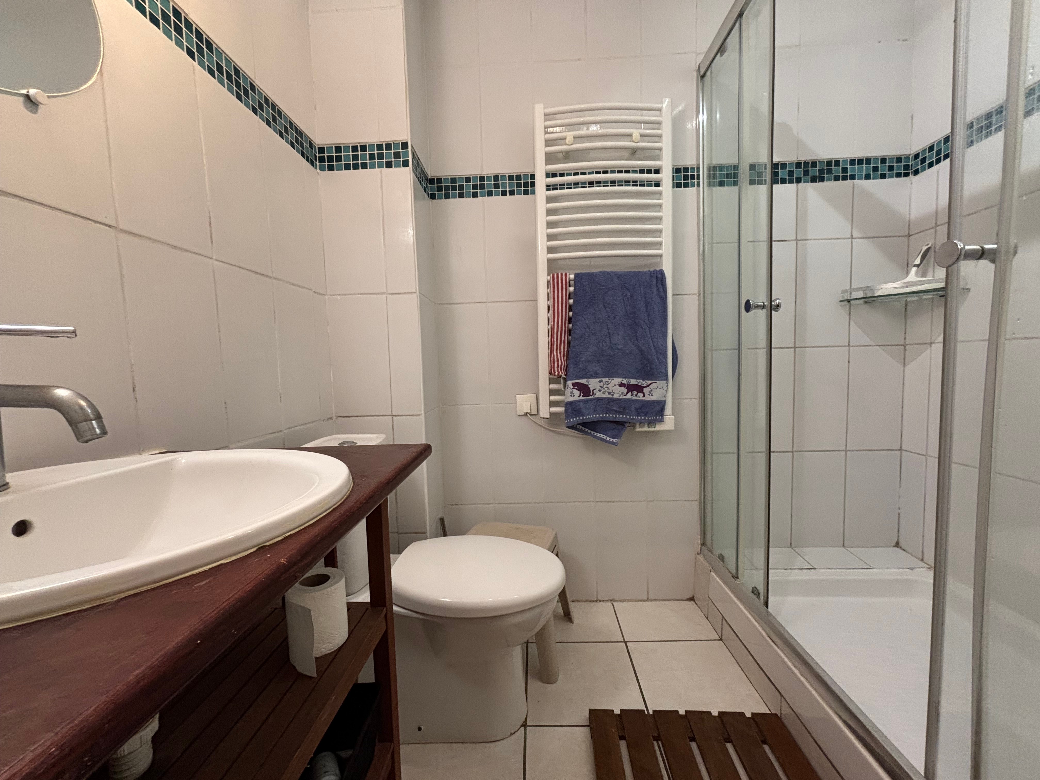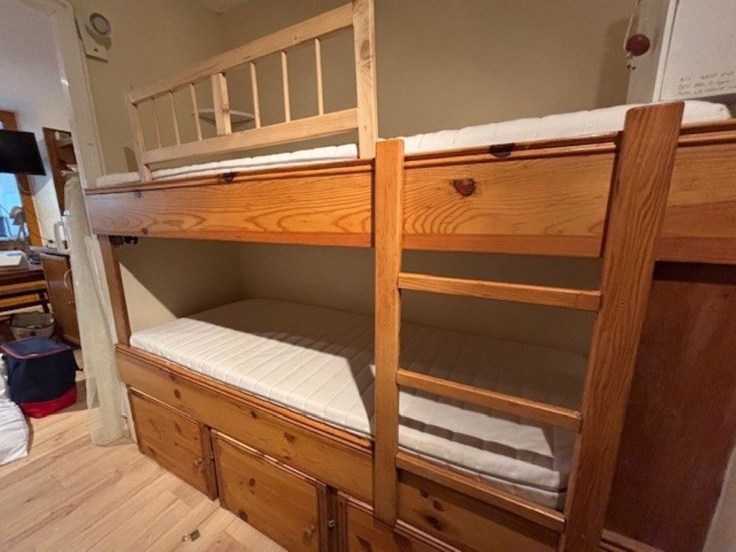 L’appartement dispose d’une chambre fermée pour plus d’intimité et de deux lits superposés situés à l’entrée, idéals pour les enfants. La salle d’eau comprend un WC intégré. La cuisine est entièrement équipée avec un four, un micro-ondes, un grille-pain et une cafetière, vous permettant de préparer vos repas en toute simplicité.