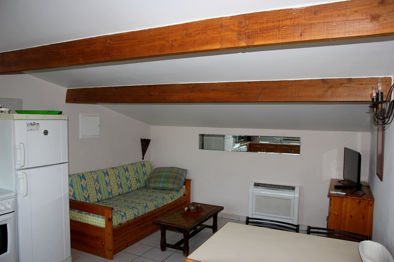 Composé de trois parties intérieures, la première pièce est une cuisine ouverte sur le salon. Son canapé avec de vrai matelas est convertible en couchage, table et chaises pour les repas. Équipé d’un téléviseur écran plat avec les chaines de la TNT, et de la connexion internet par wifi.