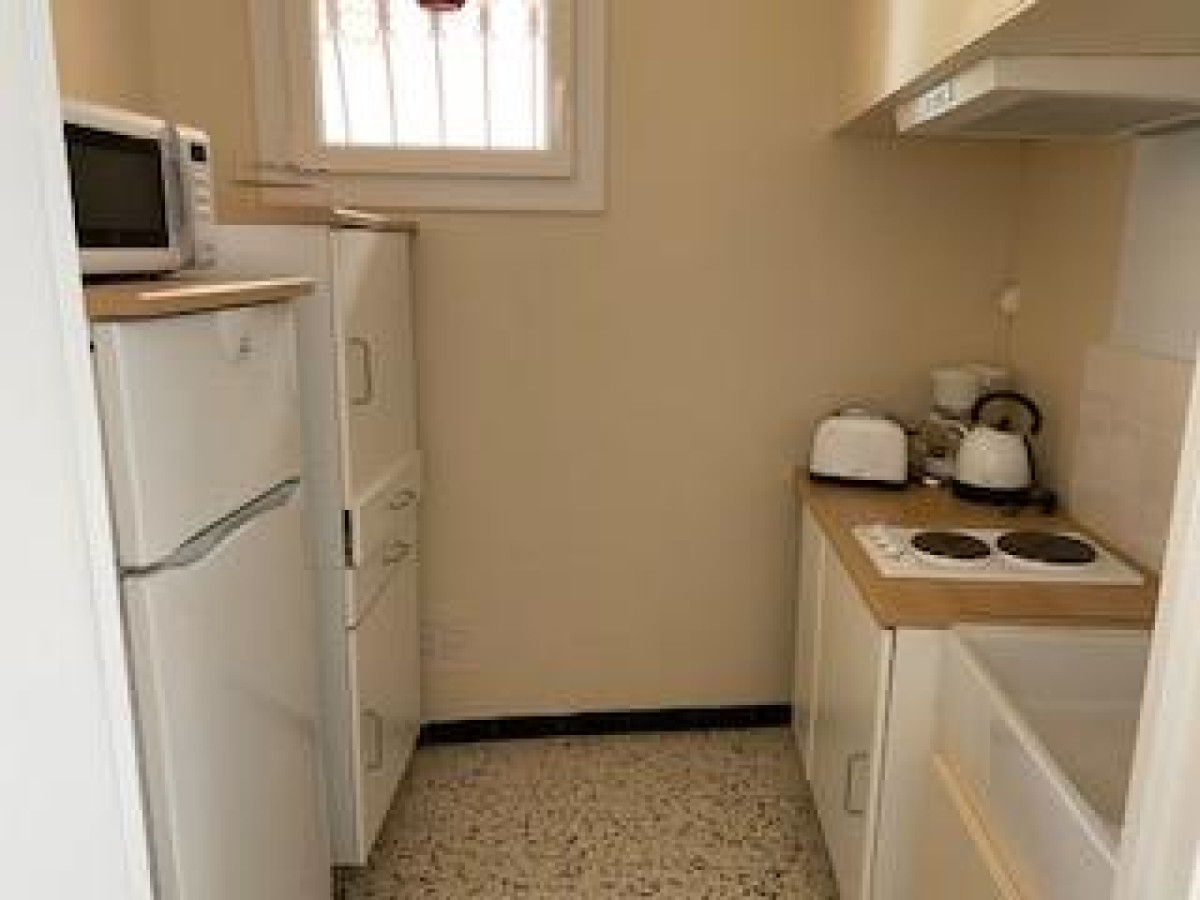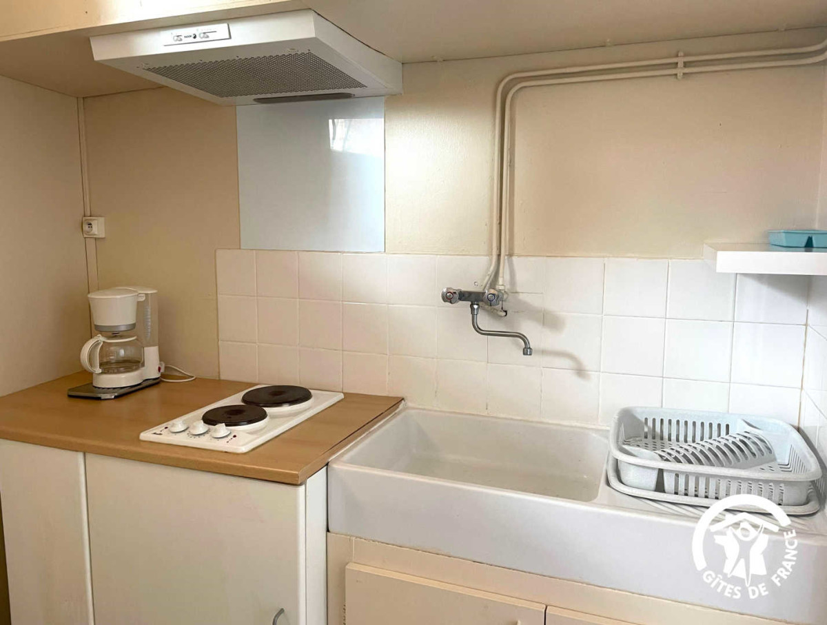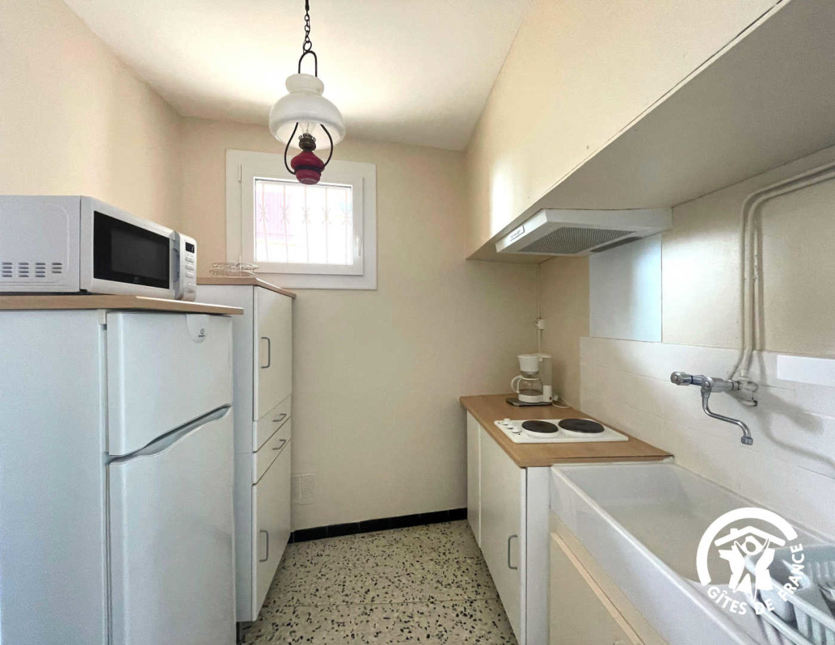 A l’intérieur, le séjour est lumineux et confortable, avec un coin salon comprenant un canapé convertible et une télévision. La cuisine, est fonctionnelle et équipée avec tout le nécessaire (plaques électriques, réfrigérateur/congélateur, micro-ondes, cafetière). La salle de bain comprend des toilettes et une douche, pour finir, une petite buanderie abrite un lave-linge.