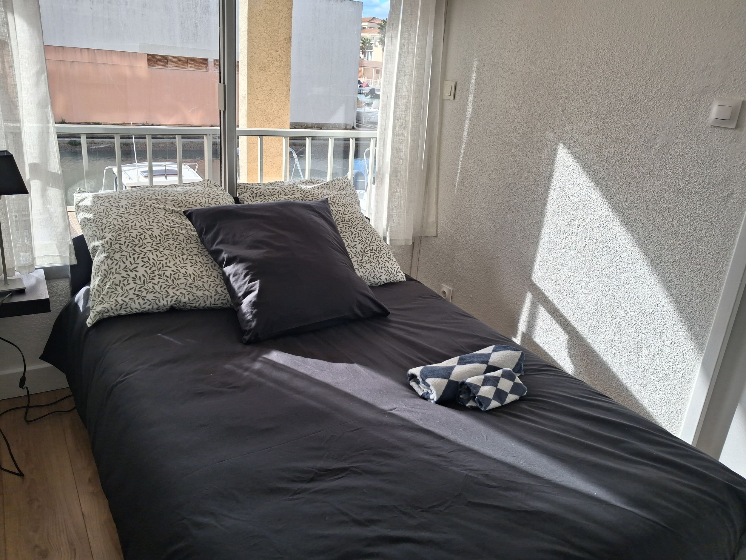 Le séjour dispose d’un canapé BZ 140 cm et la cabine d’un lit de 120 cm (on tourne autour du lit). Ces deux espaces distincts bénéficient chacun d’une large baie vitrée donnant sur la Marina des Quilles et ses bateaux. La kitchenette et l’espace cuisine disposent de tout ce qu’il faut. La salle de douce avec wc vous propose une grande douche.