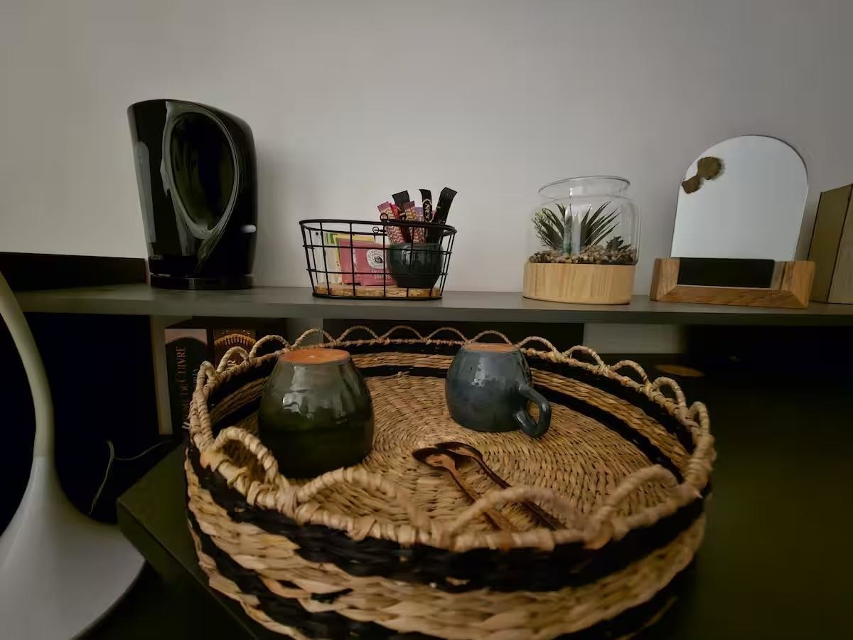 Un frigo ainsi qu’un four micro-onde, une bouilloire et une cafetière sont à disposition dans la chambre.