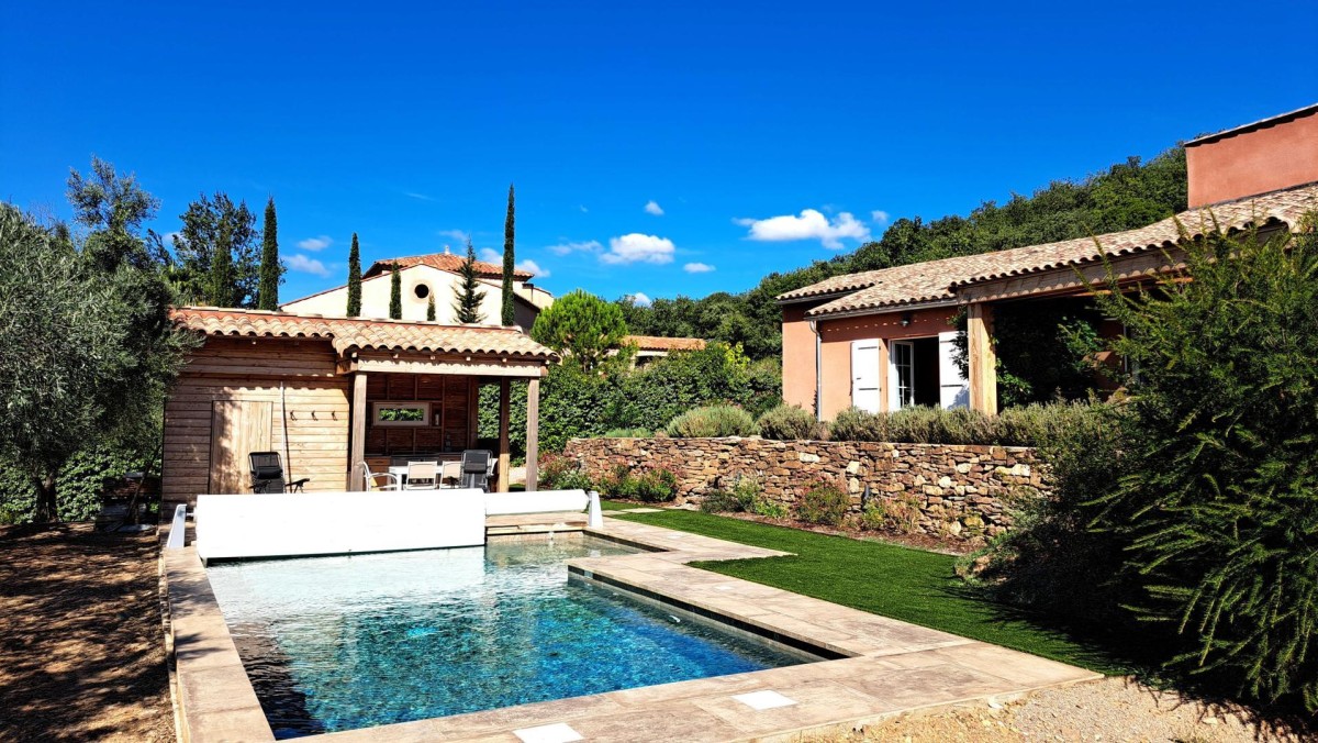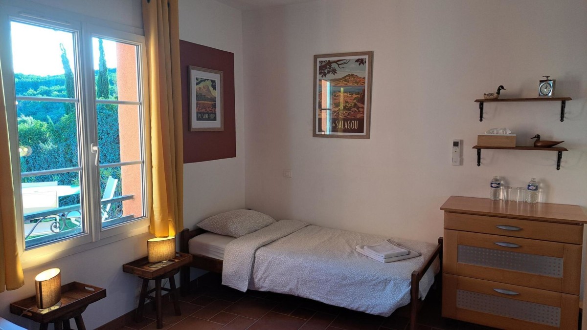 Nous y trouvons une chambre principale de 22m2 avec lit double (160*200), TV, salle de bain privée, qui donne sur une terrasse avec vue sur la piscine et les oliviers.