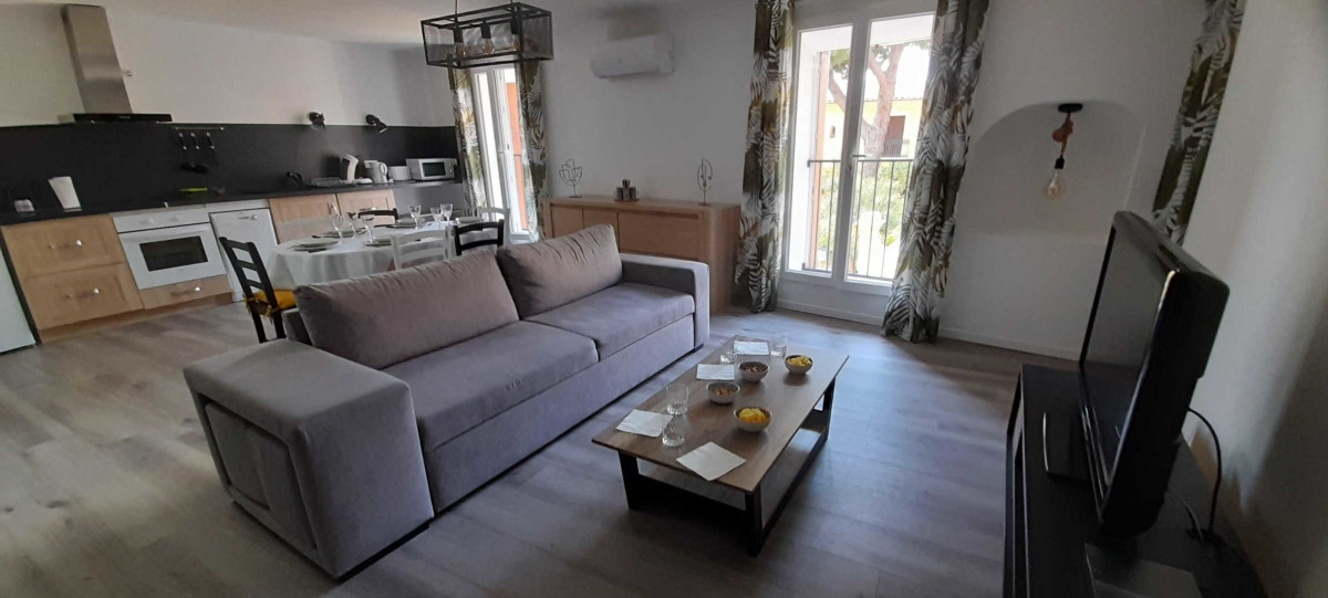 Vous trouverez sur place une pièce à vivre lumineuse avec cuisine ouverte, salon/salle à manger, une première chambre avec un lit 160×200, avec sa salle d’eau privative ainsi que d’un grand dressing, la deuxième chambre se compose de 2 lits 90×190 modulables et d’une seconde salle d’eau.
