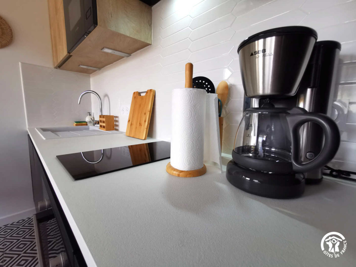 Après l’entrée, vous serez dans l’espace de vie comprenant un séjour avec TV ouvert sur la cuisine équipée (lave-vaisselle, four, réfrigérateur, cafetière..).