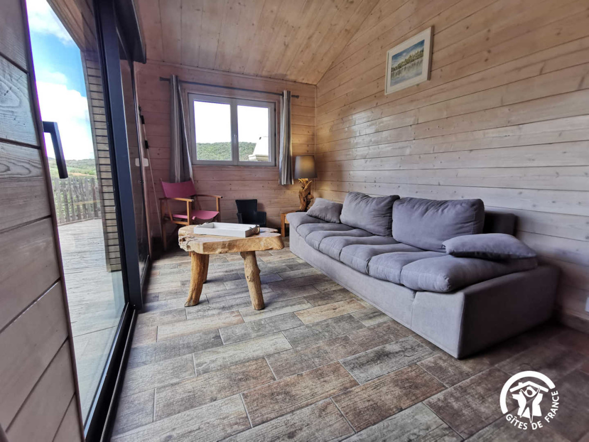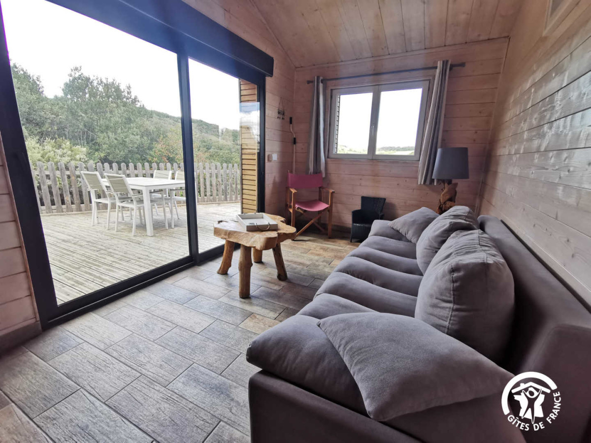 Le salon donnant accès à l’extérieur ; une grande terrasse de 25m2 avec mobilier de jardin.