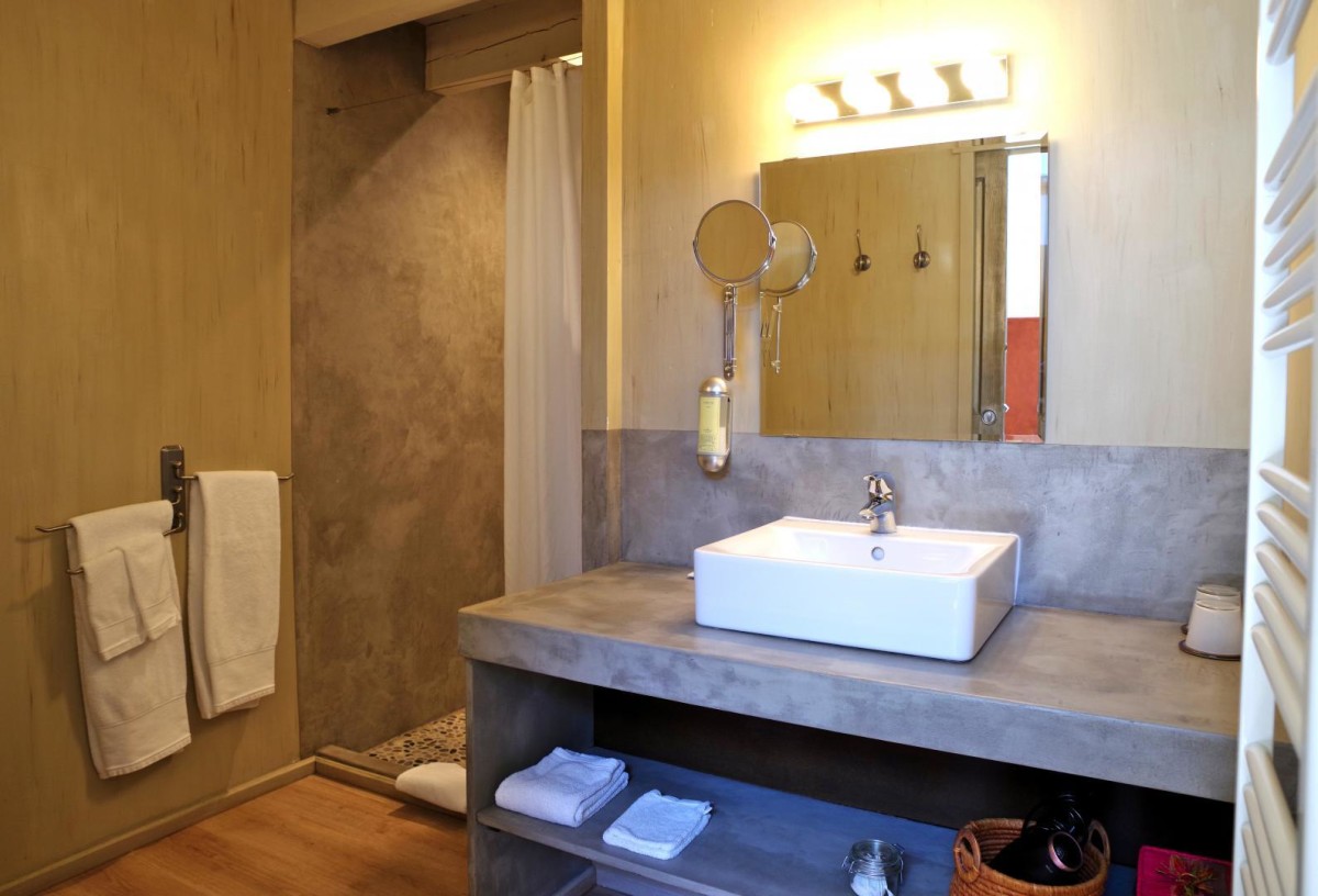 La salle de bain propose une douche à l’italienne, des wc séparés, un lavabo, savon et shampoing sans paraben sont fournis ainsi que le linge de toilette (100% coton peigné). Un sèche-cheveux complète l’équipement.