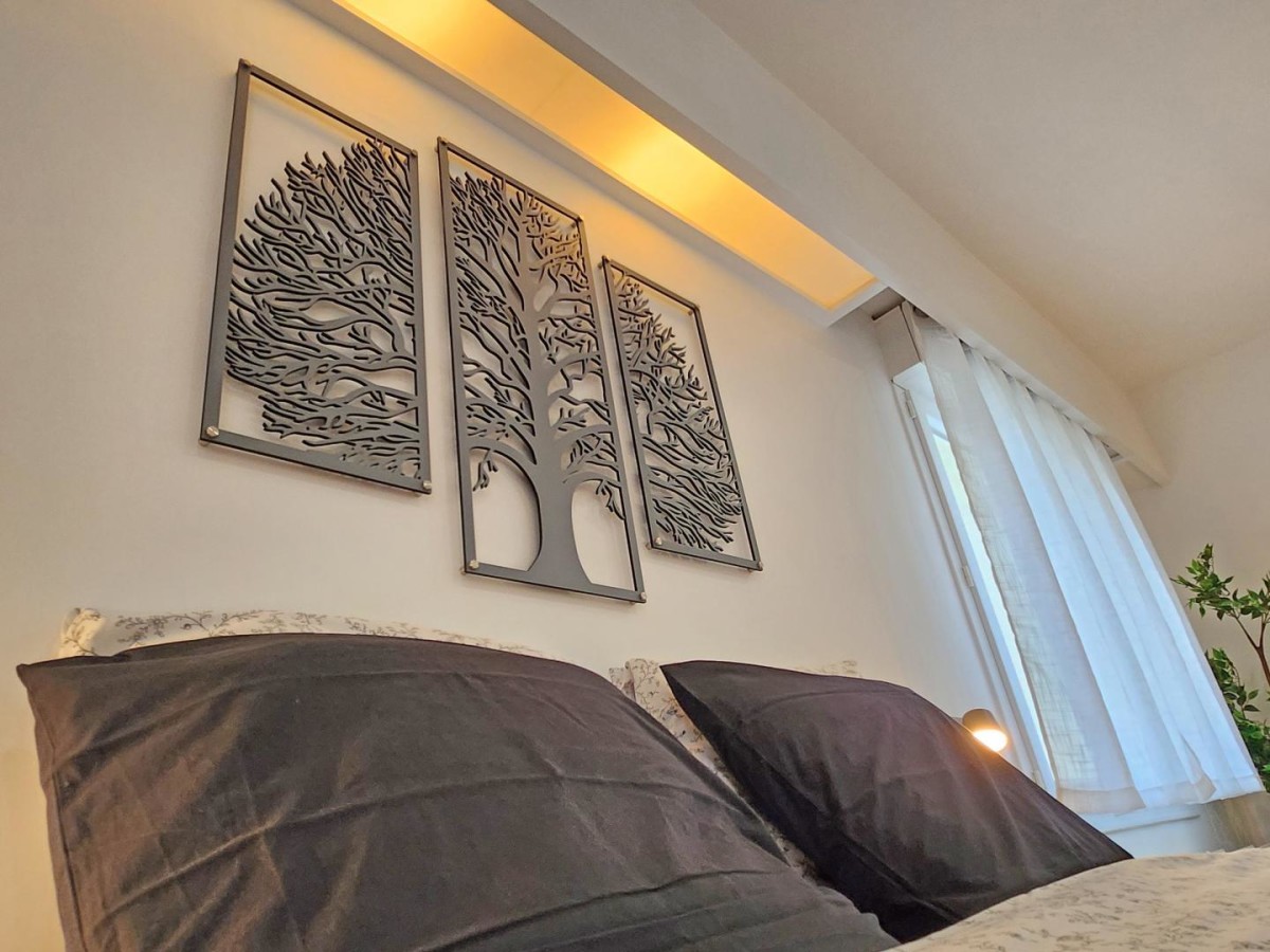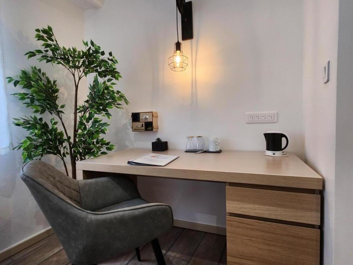 Vous pourrez vous garer de façon privative, et une borne de recharge électrique est également disponible sur demande. – Séjournez dans la chambre Lavande, une chambre spacieuse climatisée pour deux à trois personnes avec un lit double en 180x200cm et un lit simple en 90x200cm, un bureau ainsi qu’une télévision. La chambre possède également une salle d’eau avec douche, vasque avec miroir et WC.