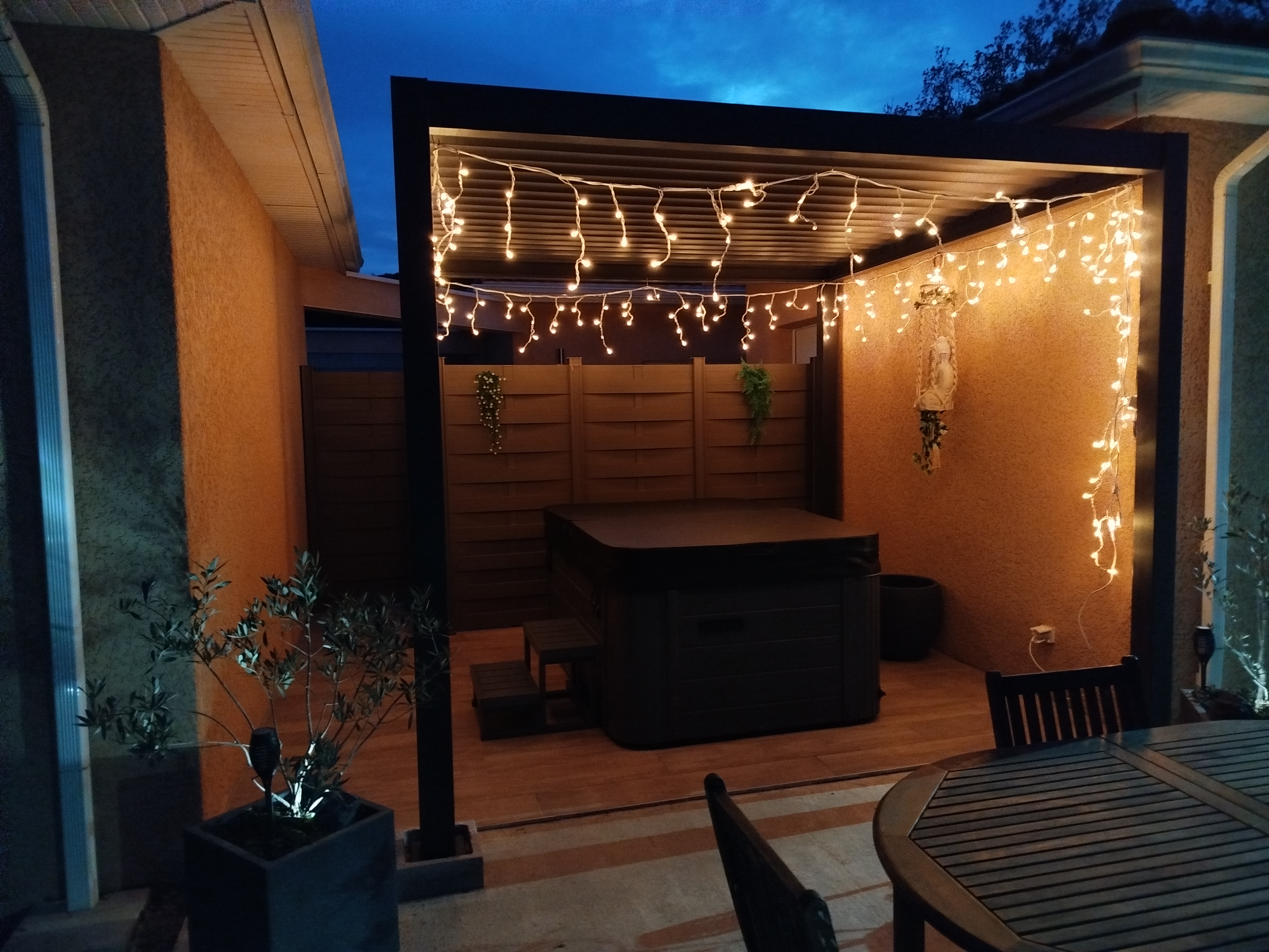 Espace privatif extérieur avec JACUZZI haut de gamme, 1H et 30€ /nuitée, luminothérapie, aromathérapie, bain bulles, jets massants, 2 places allongées, cascade, désinfection à l’ozone.