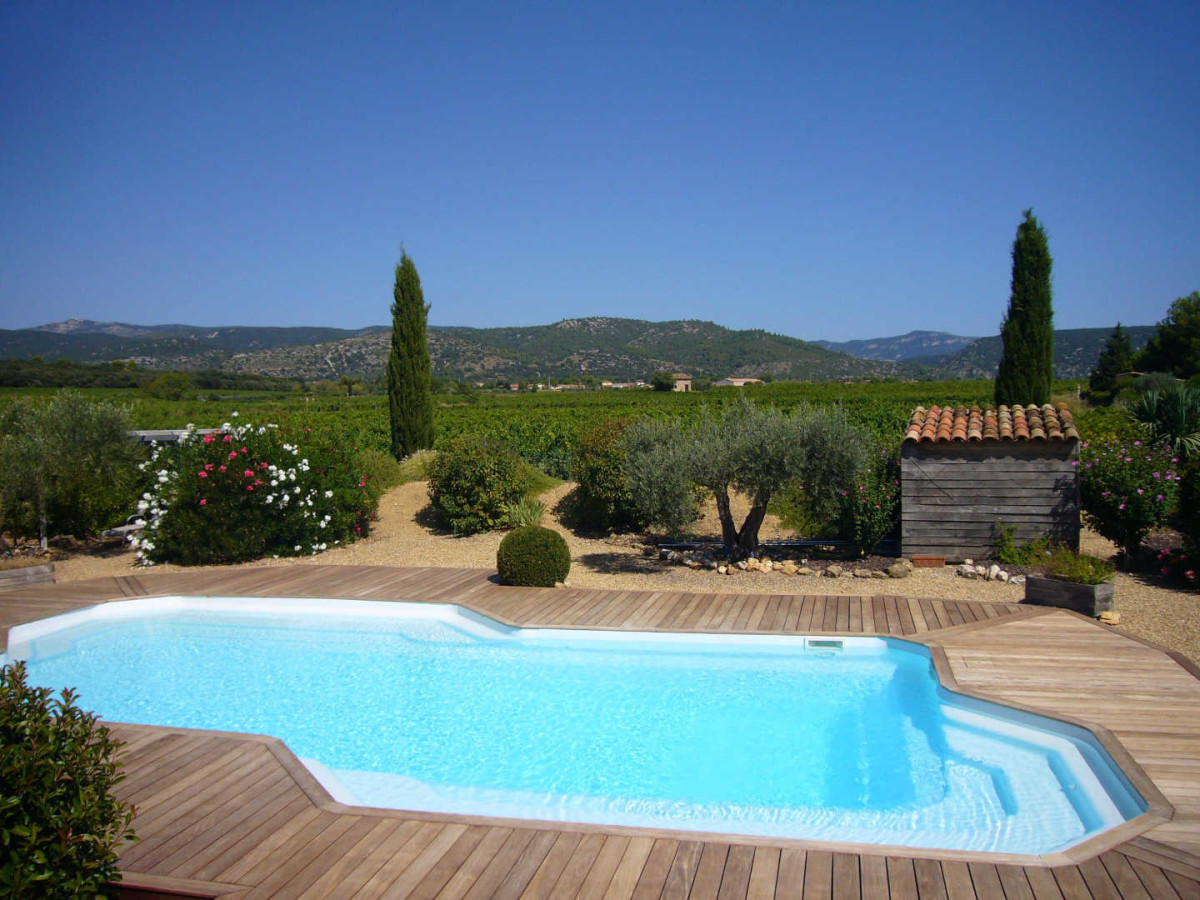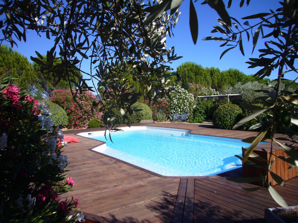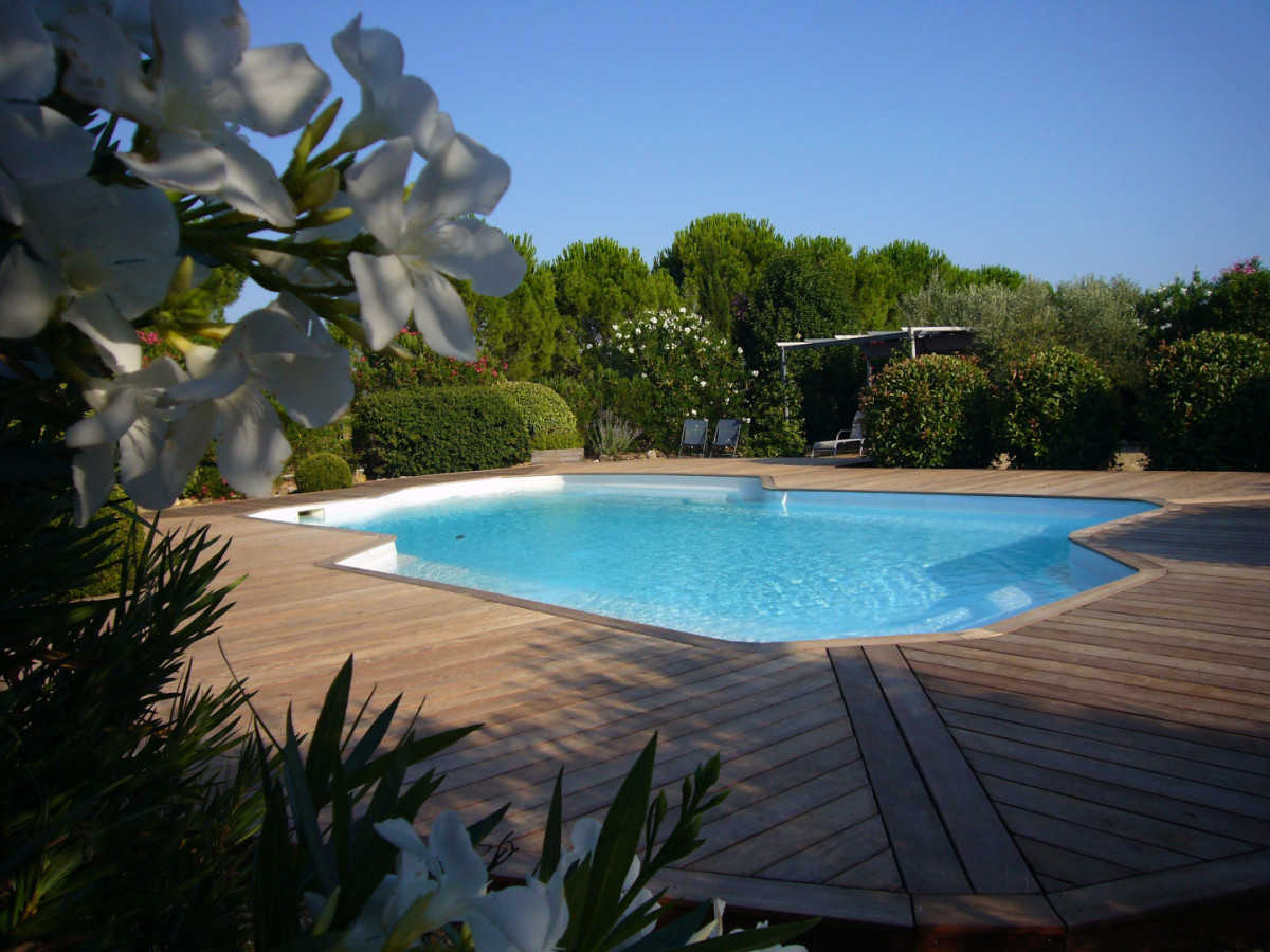 Piscine sécurisée (12×6 m, ouverte de mai à octobre) avec transats et plage en teck.