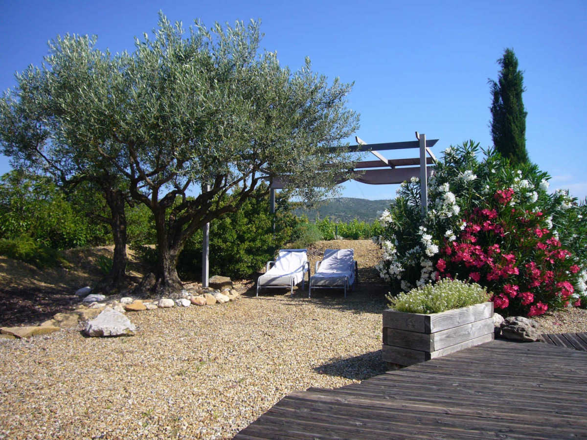 Le chemin d’accès s’arrête à l’entrée du Domaine, la route et les premières maisons sont à 1 km, vous n’entendez que le silence, les oiseaux et les cigales et ne voyez que vignes, oliviers et montagnes.