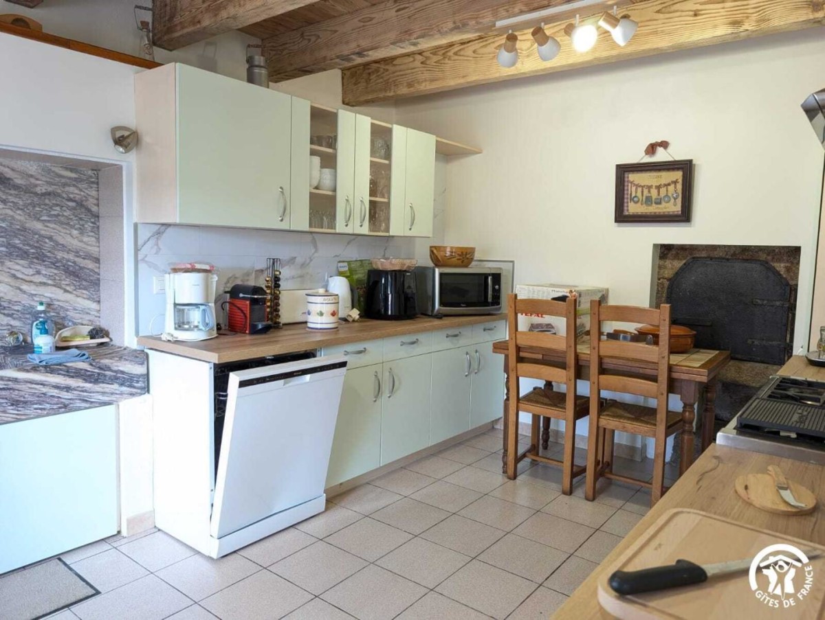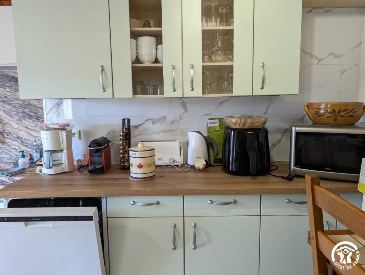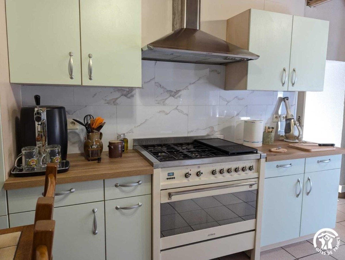 – Une cuisine de 16 m2 tout équipée avec cuisinière, four, four micro-onde, congélateur, cafetière à filtre et à dosette, airfryer, également des appareils à raclette, fondue, etc…