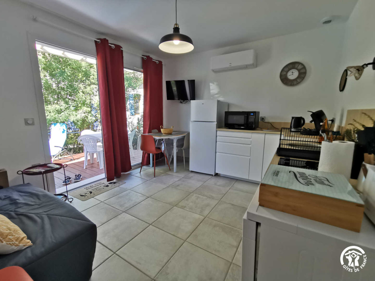 – Un espace de vie lumineux, chaleureux et fonctionnel avec cuisine ouverte équipée et salon.