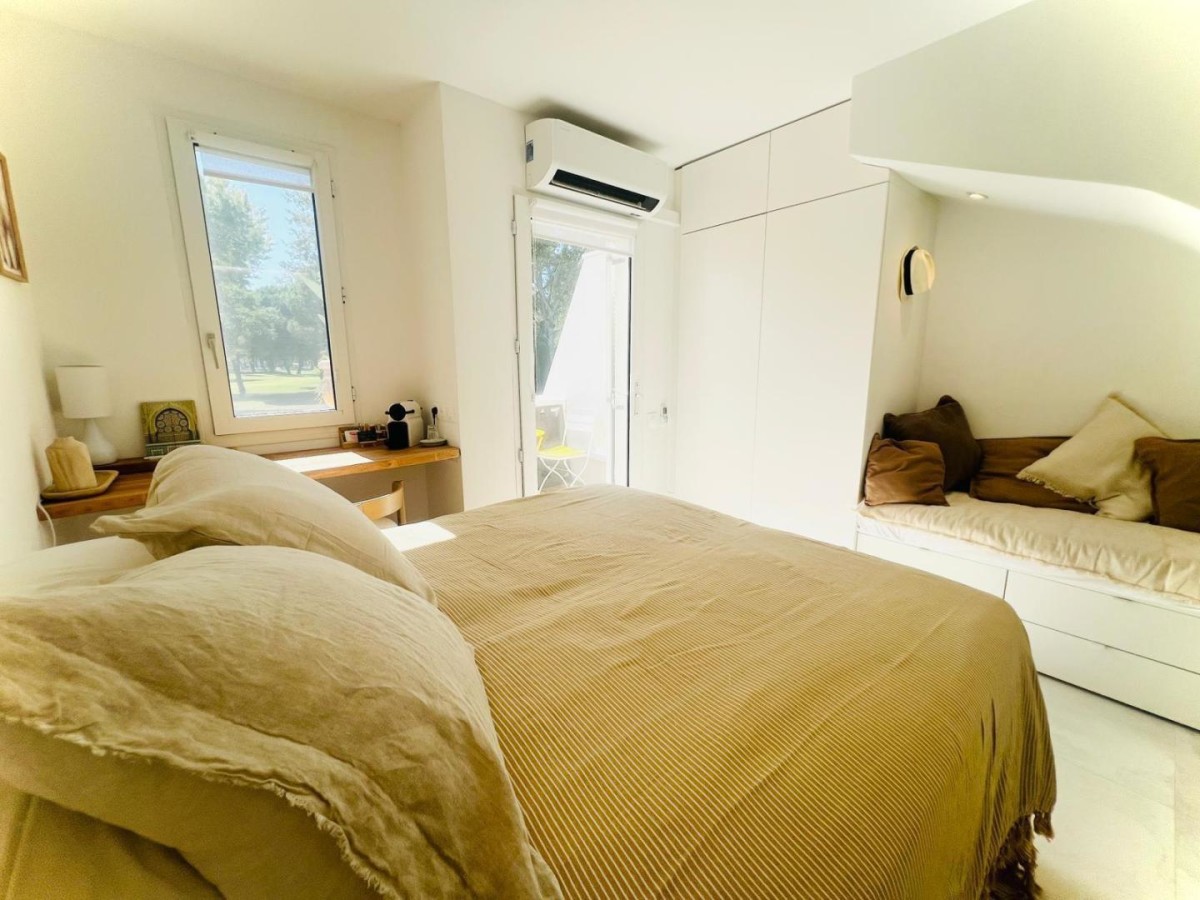 Un duplex raffiné, sur le toit, baigné de lumière ouvert sur trois terrasses intimes sans vis-à-vis, face au golf. On se laisse bercer par la douceur du Sud et l’élégance se mêle à la simplicité méditerranéenne.