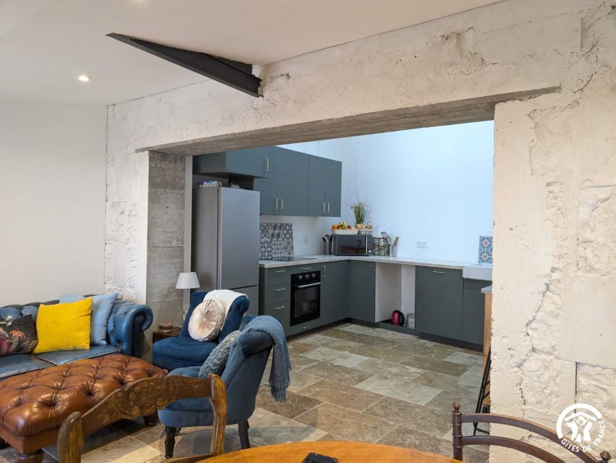 – Un séjour avec un espace détente: canapé et fauteuils, une table à manger, et une cuisine ouverte tout équipée (frigo, plaque de cuisson, lave-vaisselle, cafetière à piston,bouilloire, micro-onde , four, etc)