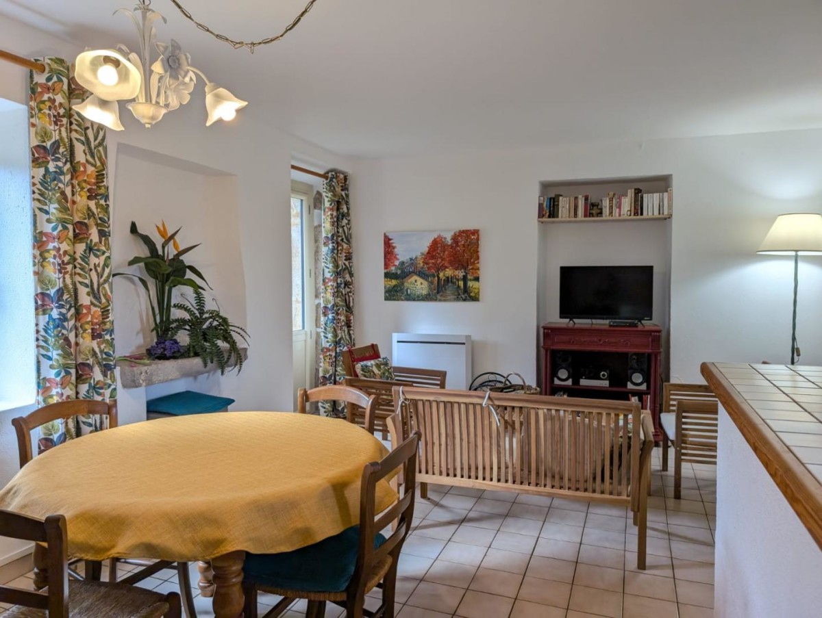 Au rez-de-chaussée : l’entrée donne sur le séjour avec sa TV et sa cheminée (insert) ainsi que le coin cuisine tout équipé à l’américaine, et des WC.