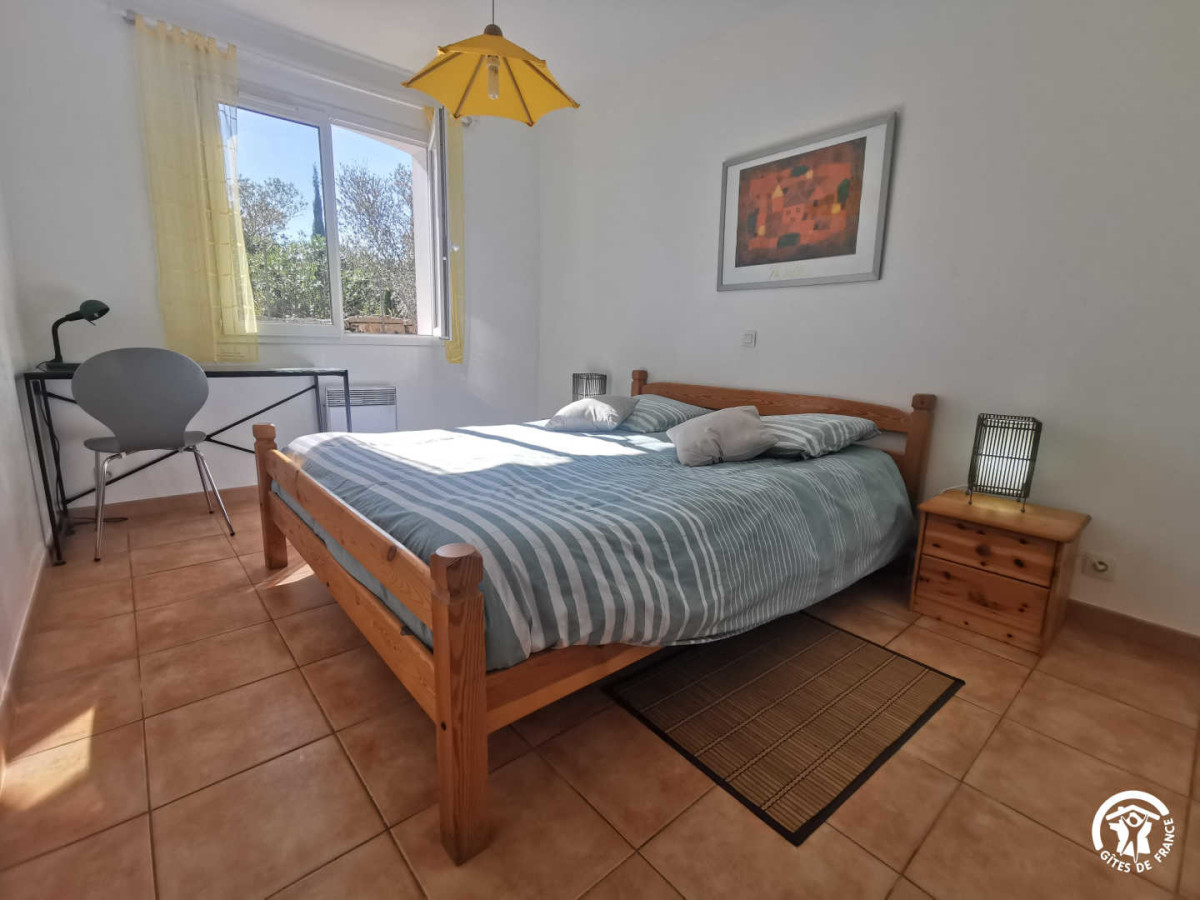Une chambre avec 1 lit en 160 cm x 200 cm, 2 tables de chevet, bureau, penderie
