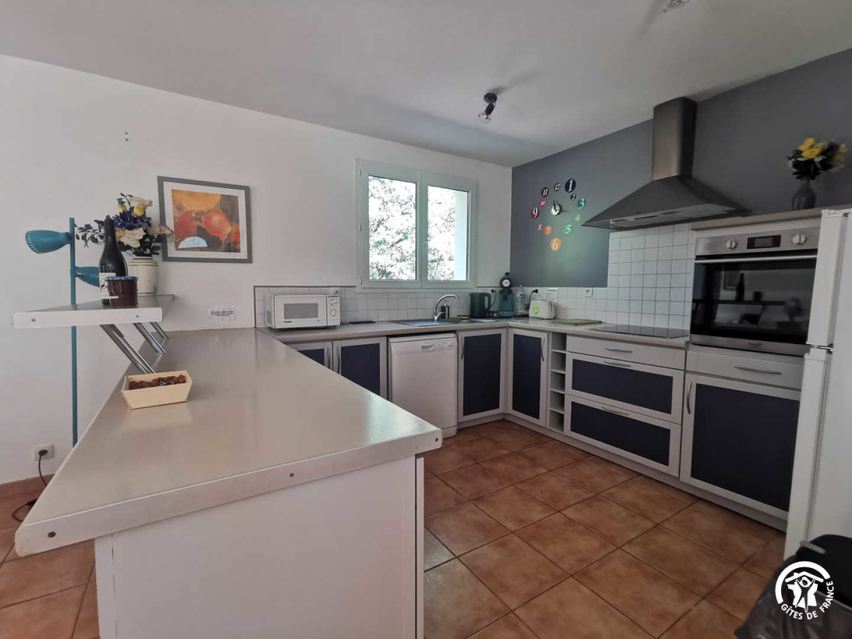 Pouvant accueillir 6 personnes, le gîte climatisé est composé d’un spacieux espace de vie salon/salle à manger ouvert sur la cuisine équipée ( (lave-vaisselle, réfrigérateur-congélateur, four, micro-ondes, grille-pain, cafetière électrique (traditionnelle + senseo), plaque induction 3 feux, etc.)