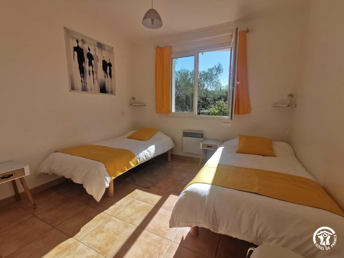 Une chambre avec 2 lits en 90 cm x 190 cm, 2 tables de chevet et penderie