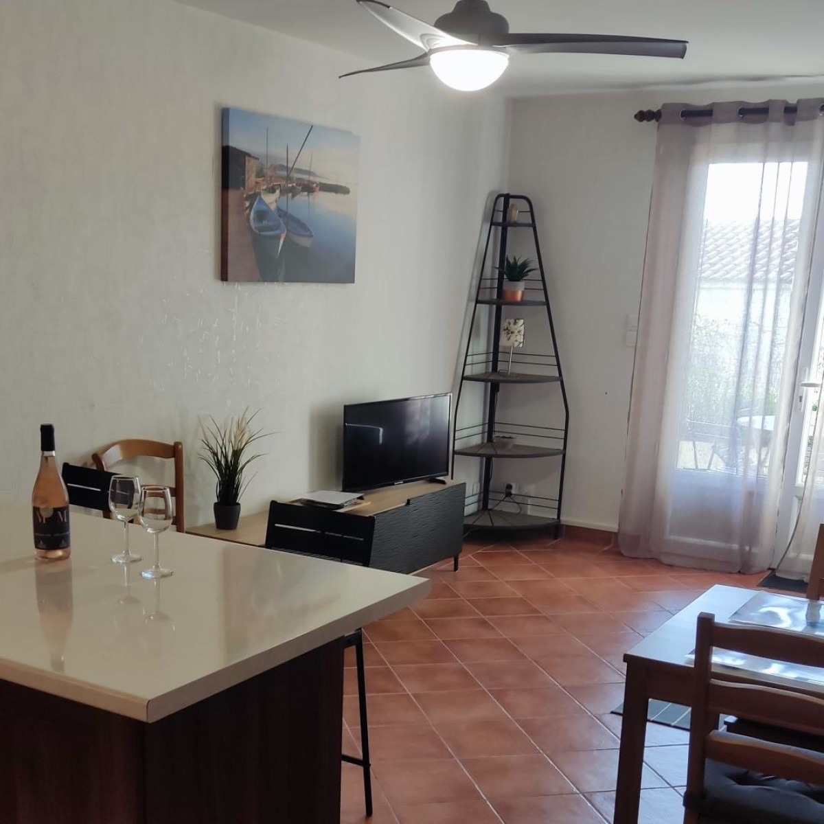Il se compose d’un grand séjour, avec un canapé, un espace repas et une grande cuisine ouverte sur le séjour. Cette dernière est toute équipée: nécessaire de cuisine, four, micro-ondes, machine à café.