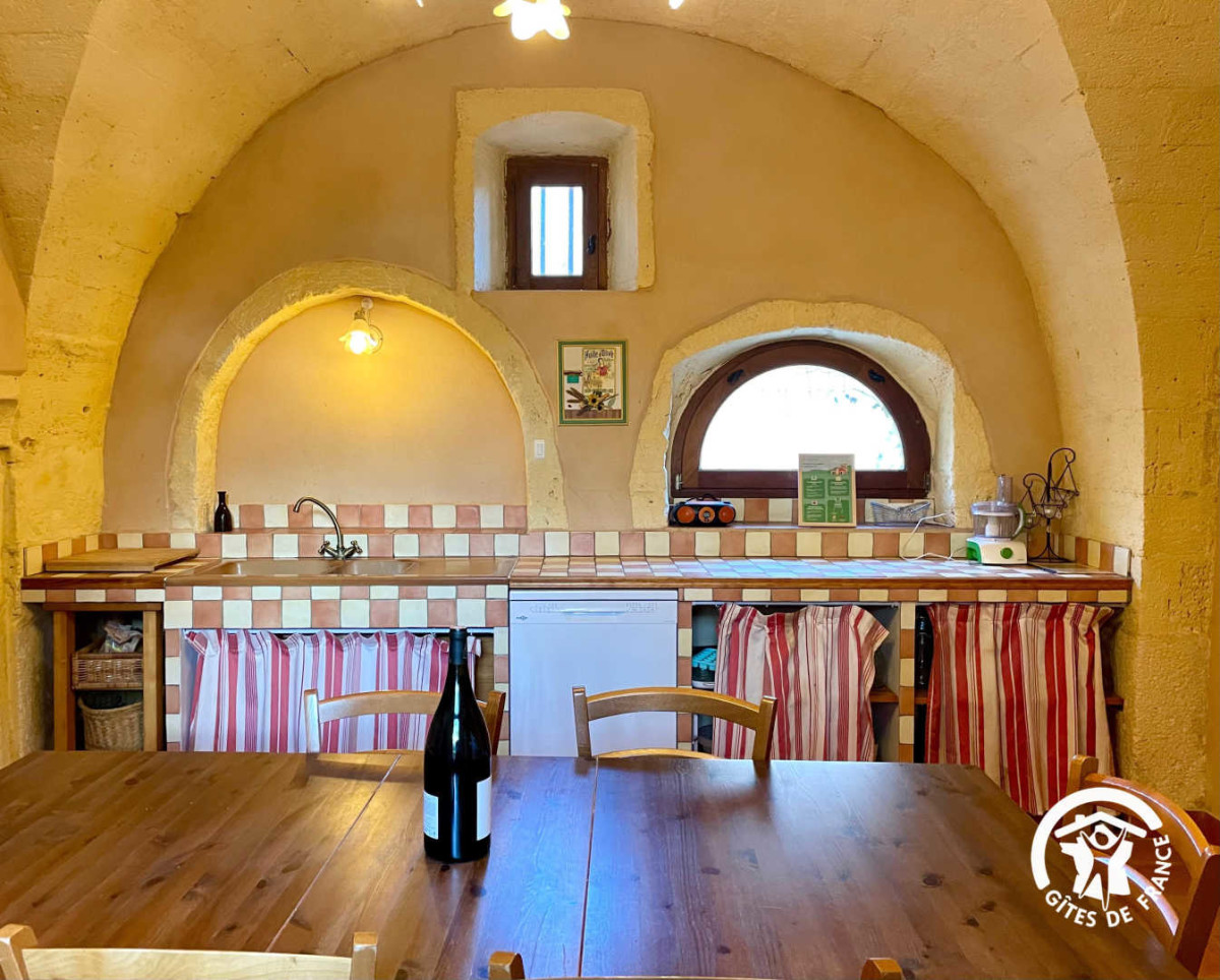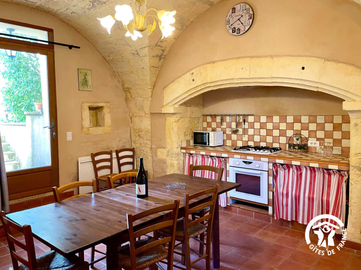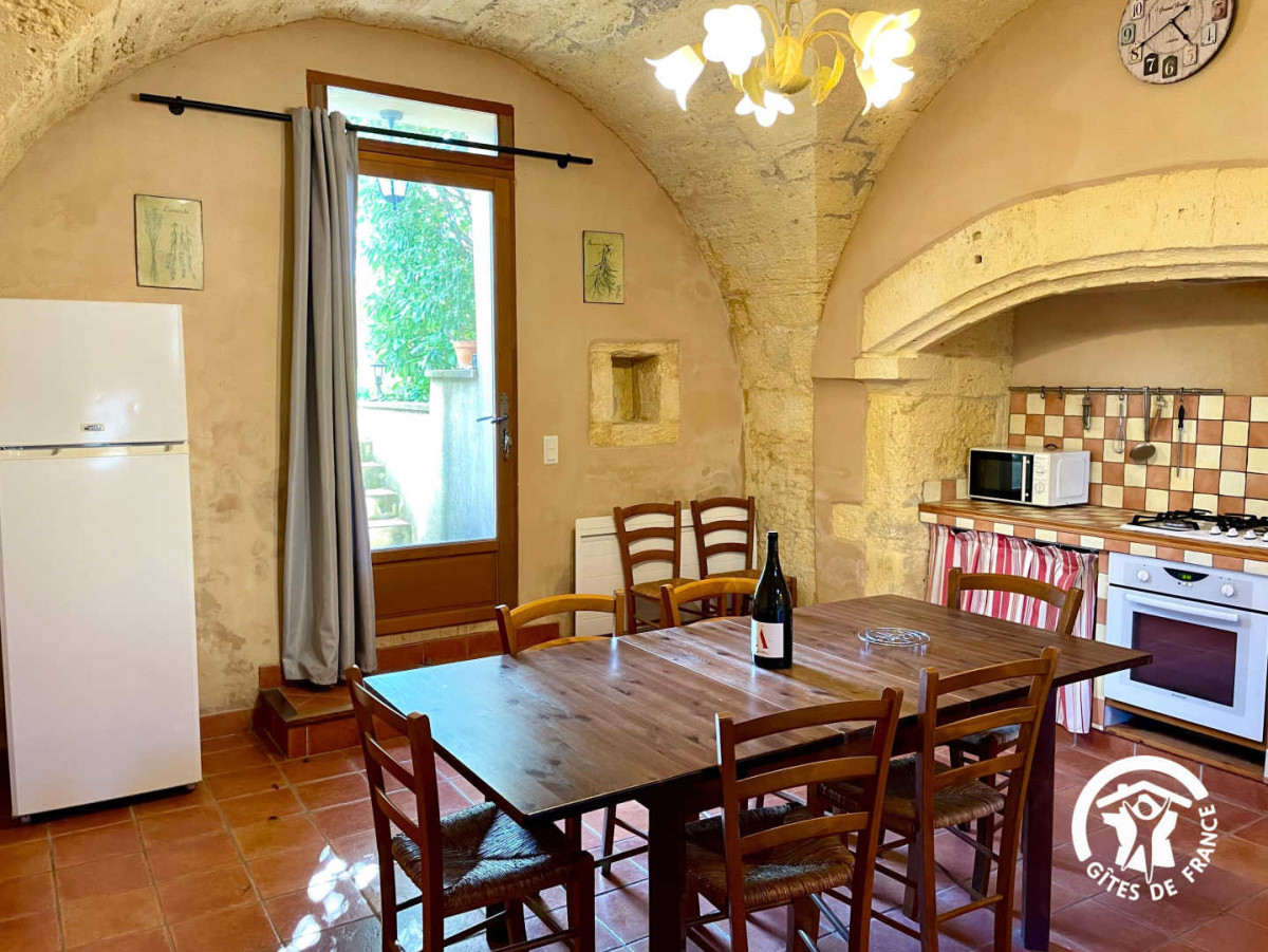 Le rez-de-chaussée voûté en pierres abrite une vaste cuisine / salle à manger équipée de tout le nécessaire (four, lave-vaisselle, réfrigérateur avec compartiment congélateur, cafetière à filtre et machine à café dosette). Vous bénéficiez également d’un accès direct à un jardin privée clos et ombragé, agrémenté d’une terrasse avec table et chaises exterieures, un barbecue, un salon de jardin ainsi que des transats.