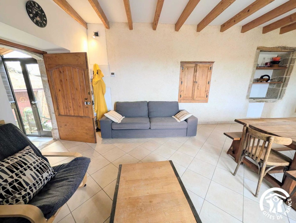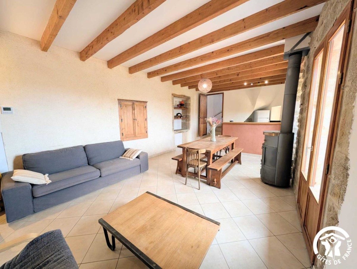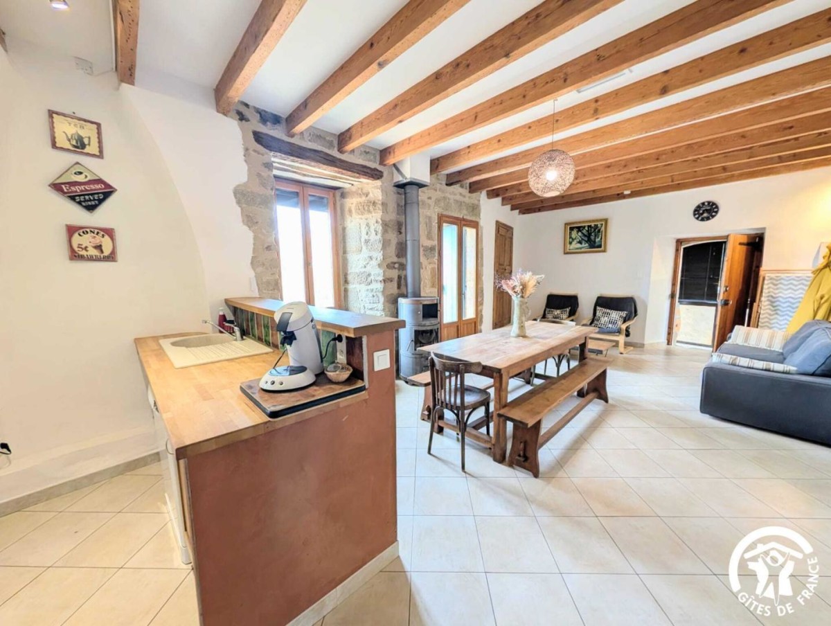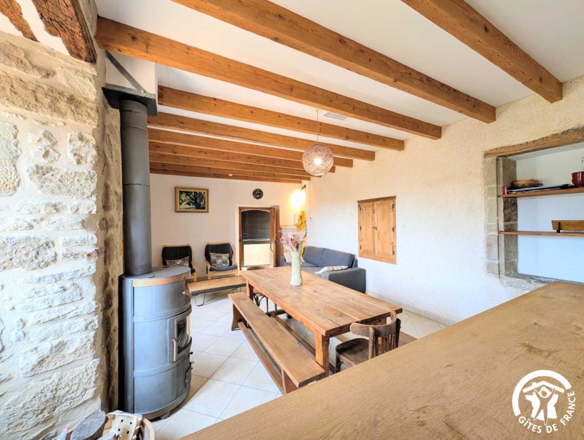 Aménagée dans une maison en pierres de pays, cette maison mitoyenne allie charme traditionnel et équipements contemporains. Au rez-de-chaussée, la pièce à vivre regroupe un espace salon avec canapé, fauteuils et télévision, une salle à manger conviviale et une cuisine ouverte équipée d’un micro-ondes, d’un lave-vaisselle, d’un réfrigérateur avec compartiment congélateur, d’une gazinière avec four à gaz, d’une bouilloire, d’un lave-linge ainsi que de machines à café Senseo et Nespresso. Le poêle à bois, avec bois fourni, apporte une ambiance chaleureuse en toute saison.