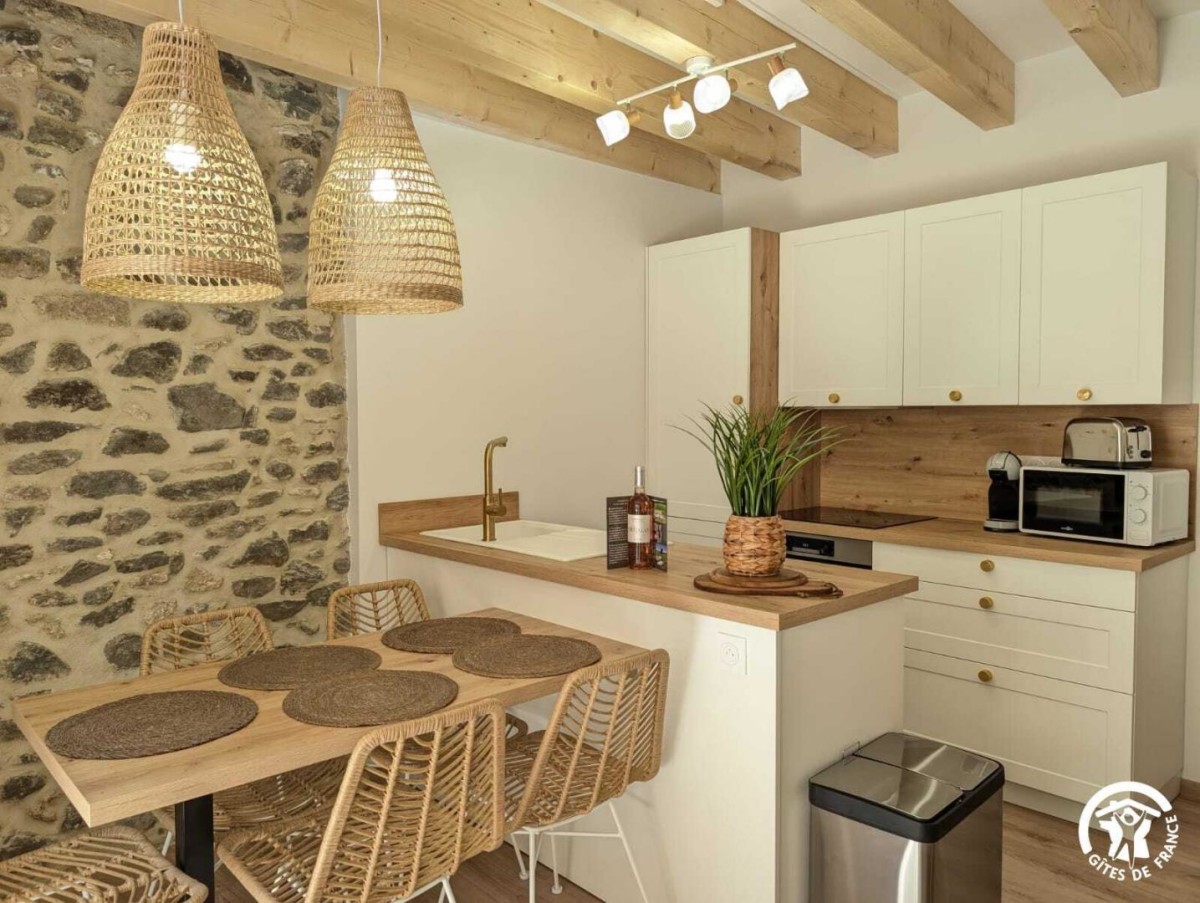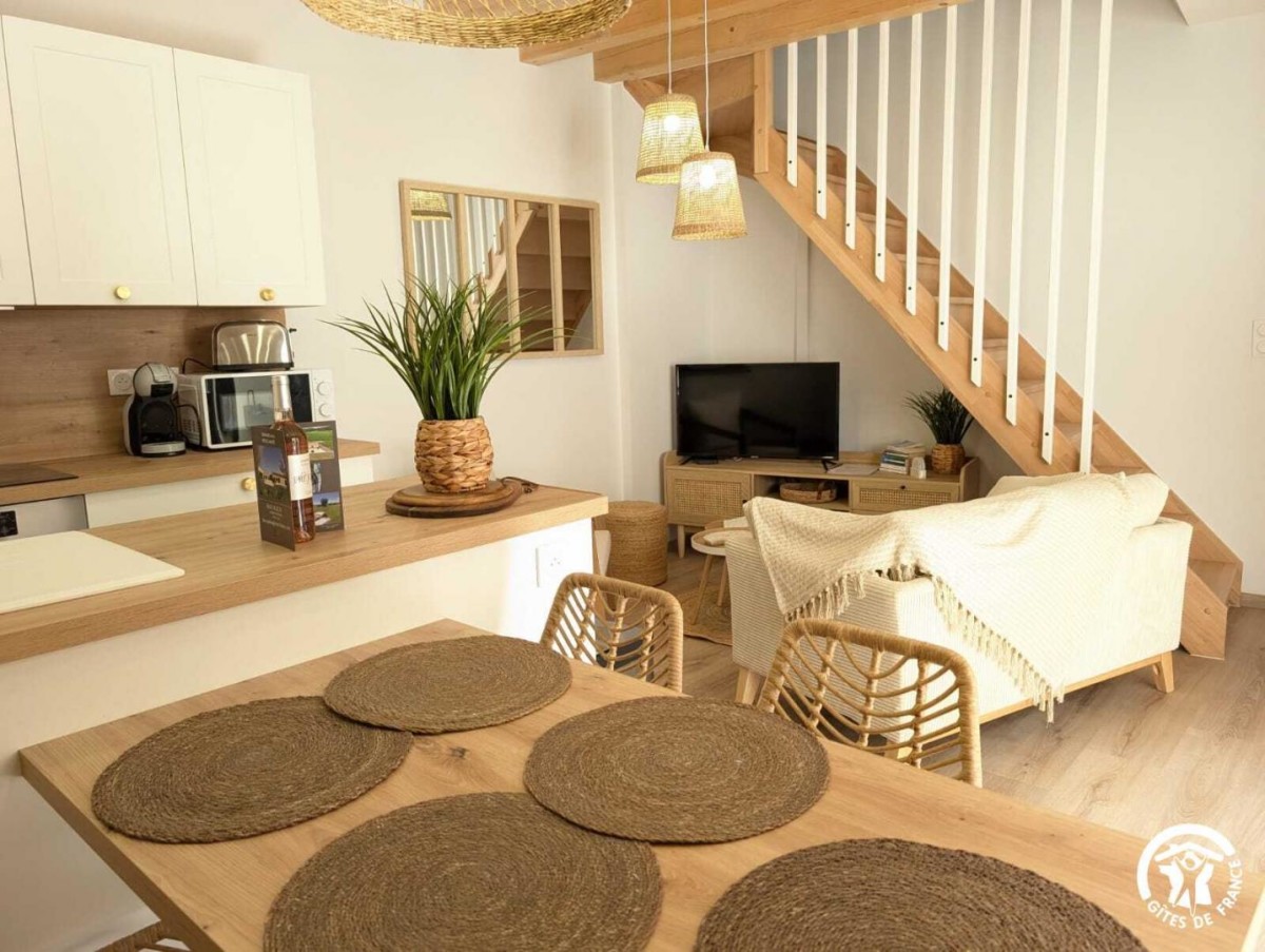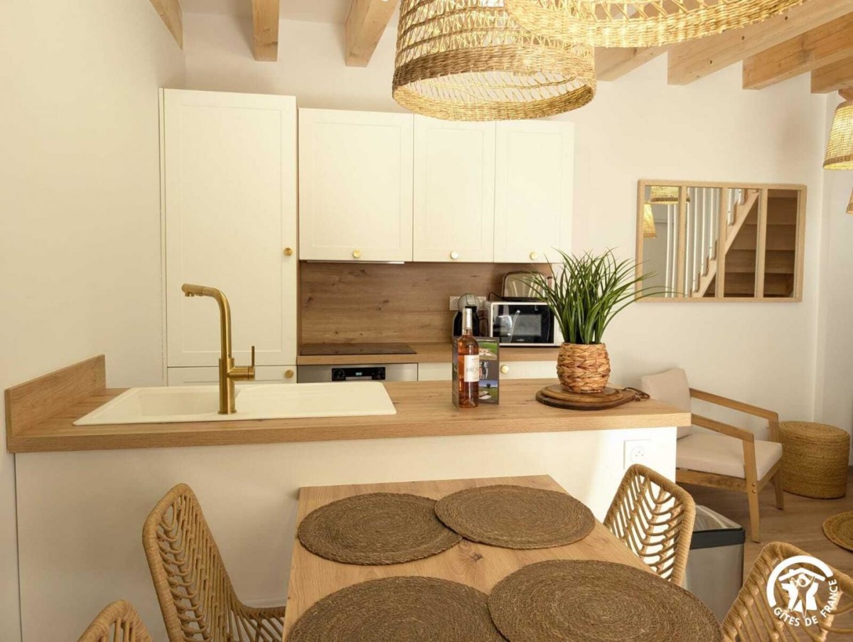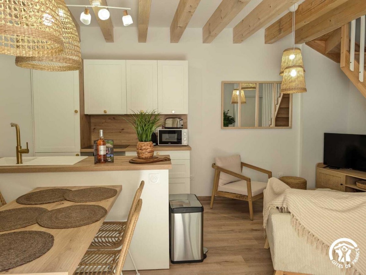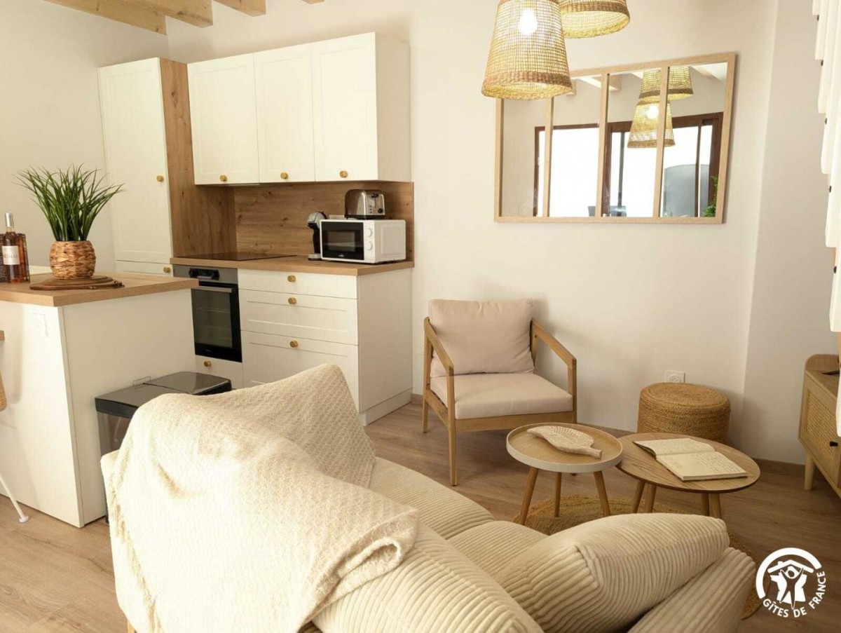 – Un séjour avec cuisine ouverte tout équipée (frigo, plaque de cuisson, four, lave-vaisselle, cafetière dosette, bouilloire, congélateur.