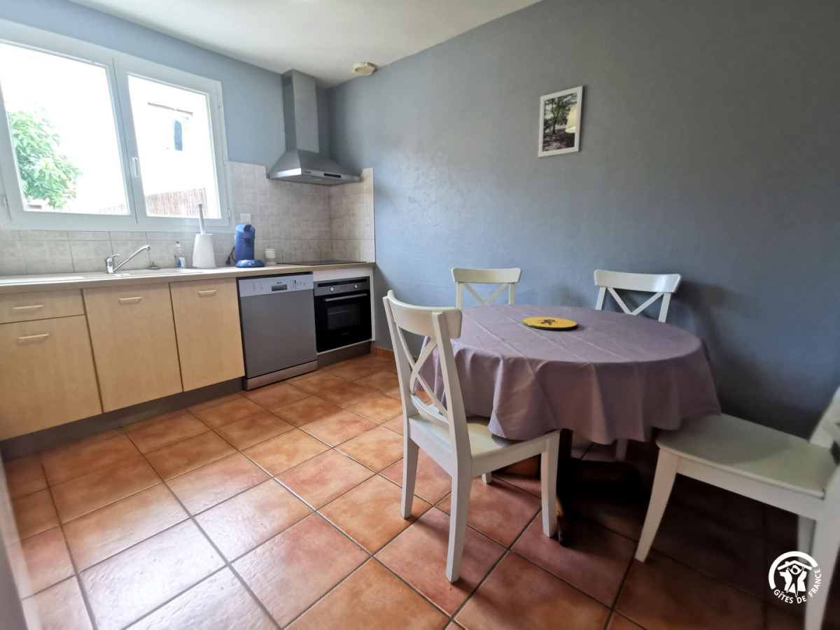 Cette maison, comprend une grande pièce de vie climatisée de 35 m² avec salon, TV, et salle à manger. La cuisine toute équipée (four, réfrigérateur, lave-vaisselle, cafetière à filtres et Senseo..) est séparée.