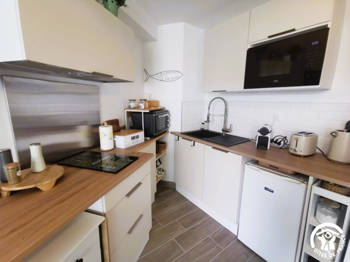 – Une belle pièce de vie avec canapé, table à manger et cuisine bien équipée avec four, micro-ondes, réfrigérateur top avec compartiment congélateur, lave-vaisselle, machine à café et le nécessaire de cuisine pour un agréable séjour ;