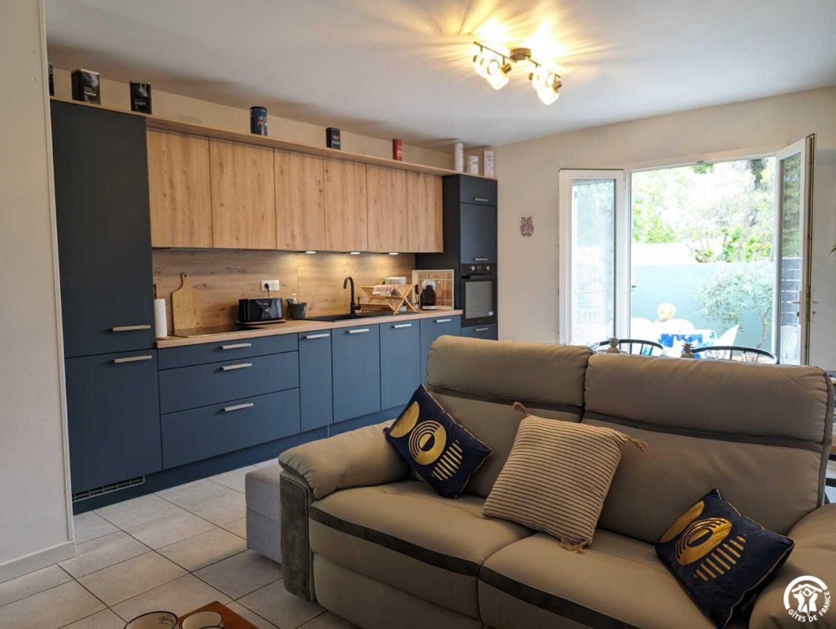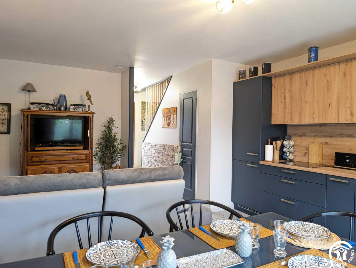 Au rez-de-chaussée, on trouve un séjour/cuisine très agréable. La cuisine est neuve et très bien équipée (frigo, plaque à induction, lave-vaisselle, four, micro-onde, etc…).