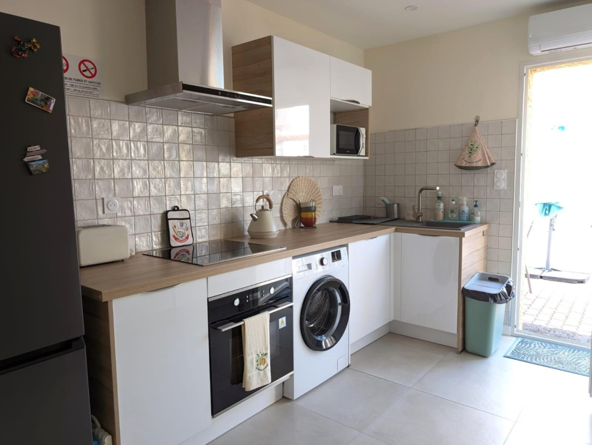 – Une terrasse privative avec table, chaise et parasol et une cuisine d’été (barbecue et évier)