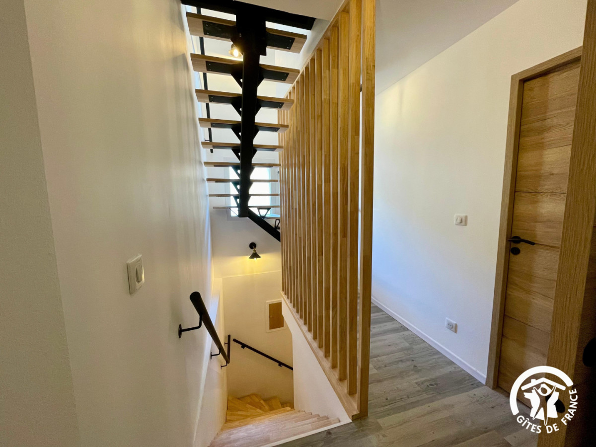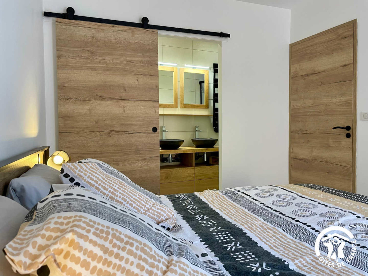 Au premier étage, découvrez la chambre climatisée avec sa salle d’eau attenante, comprenant une grande douche, deux vasques et un sèche-serviette électrique. La chambre elle, est équipée d’un lit confortable en 160×200 et d’une grande armoire. Les toilettes sont indépendantes et situées dans le couloir.