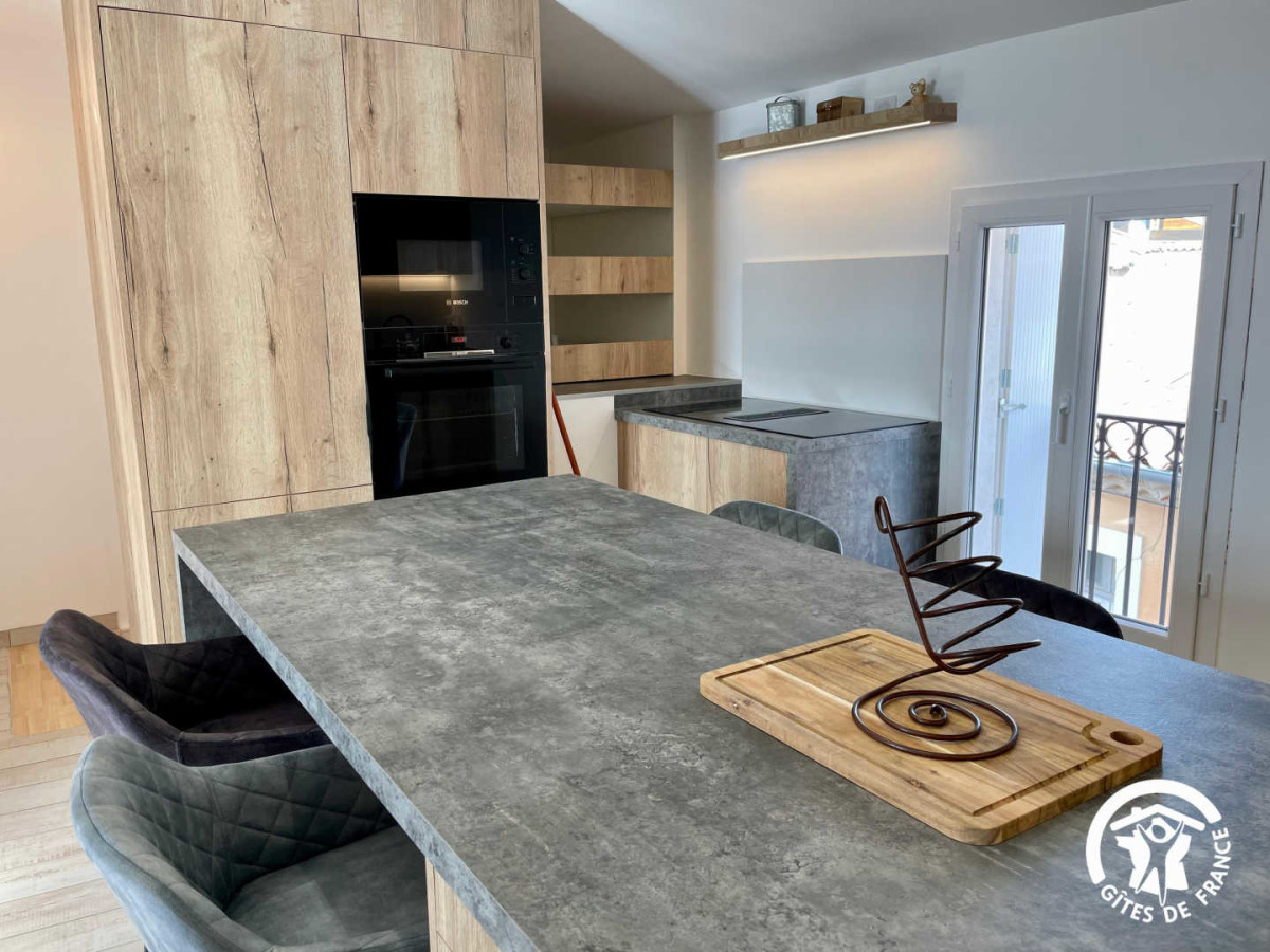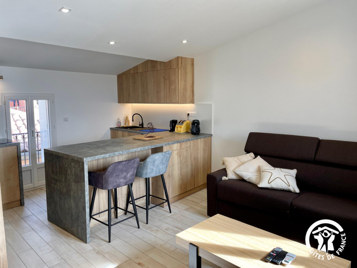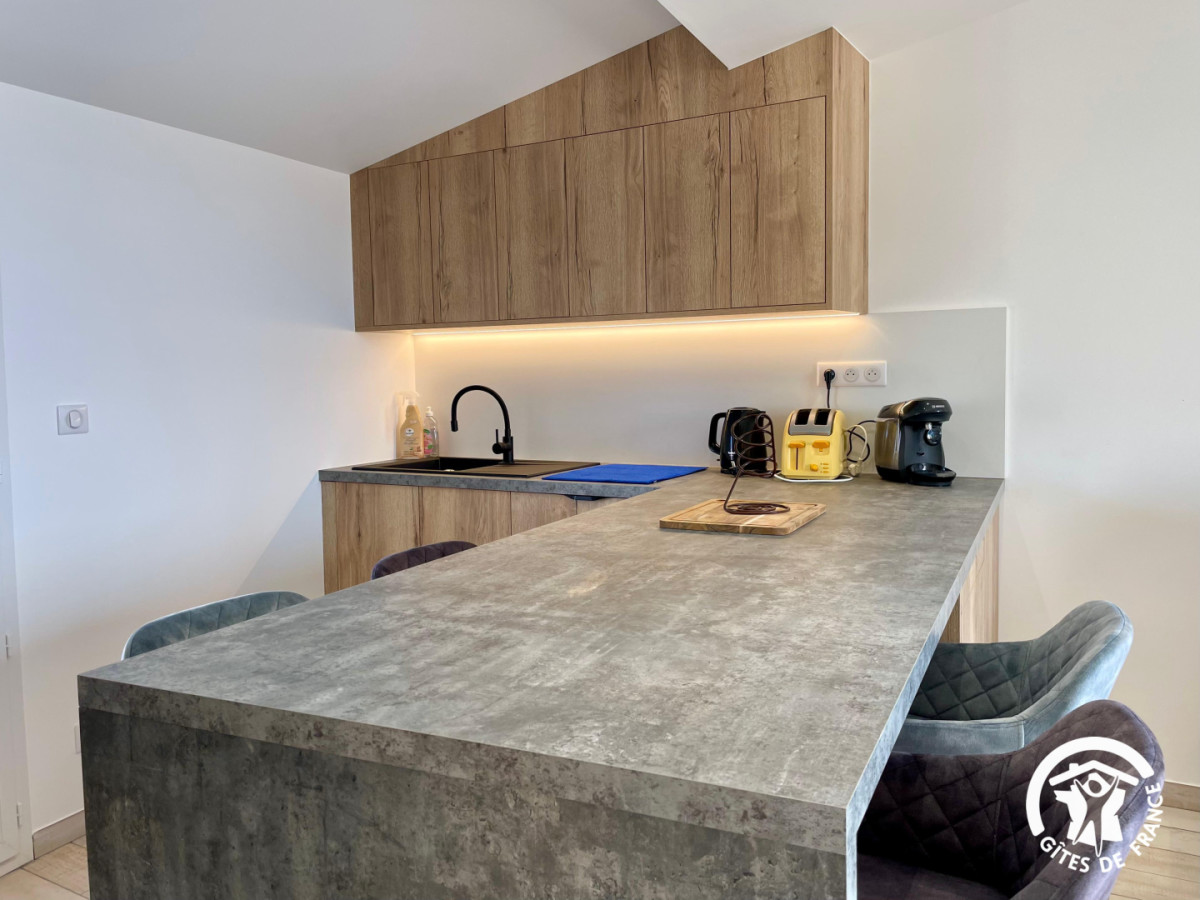 Au deuxième étage, la pièce de vie se compose d’un salon avec un canapé-lit offrant une solution de couchage d’appoint, ainsi que d’une grande télévision connectée. La cusine intégrée est spacieuse et composé d’un large bar. Elle est équipée de tout le nécessaire avec notamment un four, un grand réfrigérateur avec compartiment congélateur, un lave vaisselle, un micro-onde, une cafetière Bosch Dolce Gusto, un grille pain et une bouilloire.