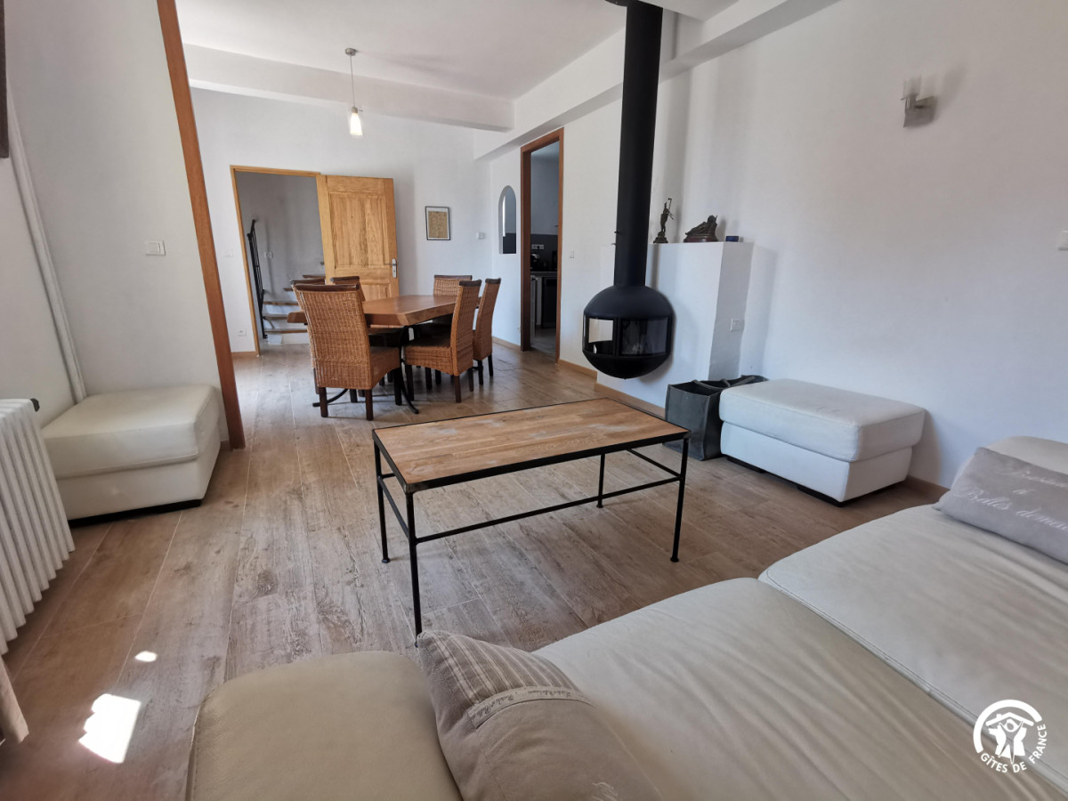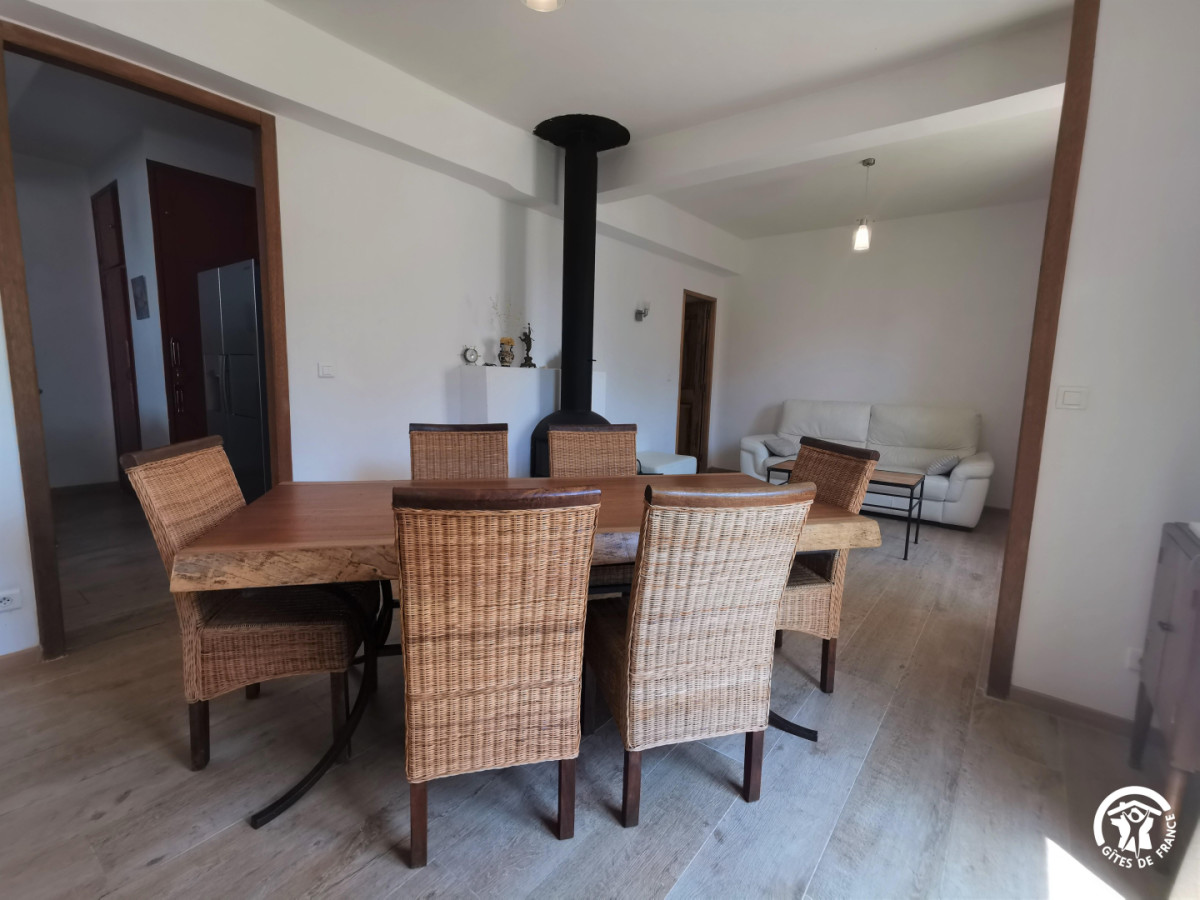 Au premier étage, vous trouverez une pièce de vie (salle à manger/salon avec un poêle) dans une ambiance épurée et reposante.La cuisine est indépendante et toute équipée.